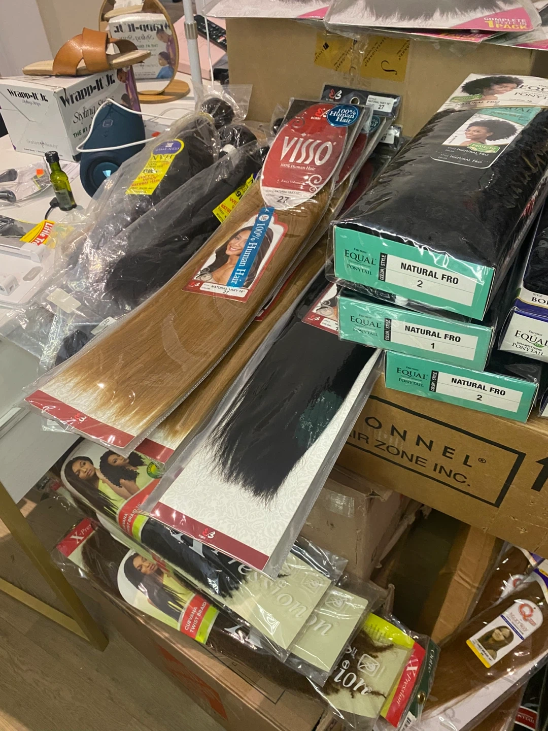 A selection of various hair extensions and wigs are available. Brands include Equal, Visso, and X-Pression. Perfect for trying out a new style! with makeup and skincare products