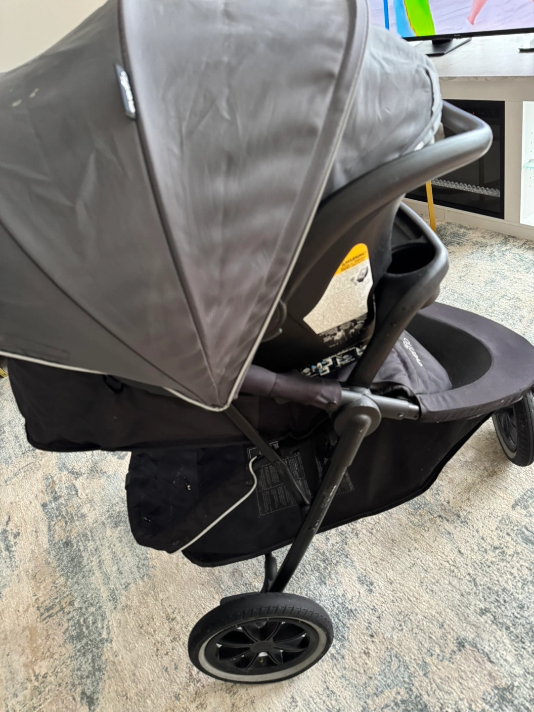 Three-wheel stroller, grey and black. Includes infant car seat. Good condition. Lightweight and easy to manoeuvre.