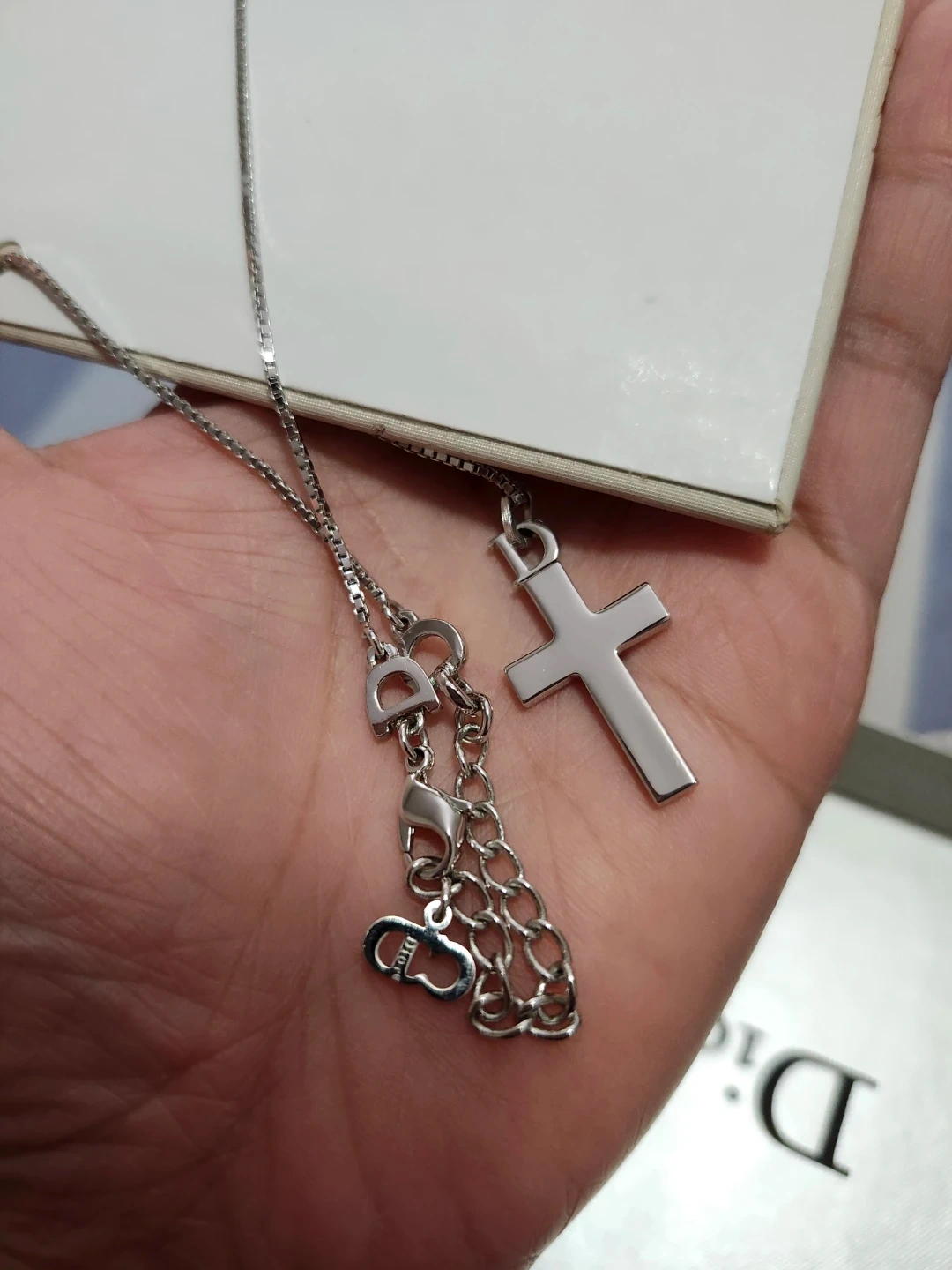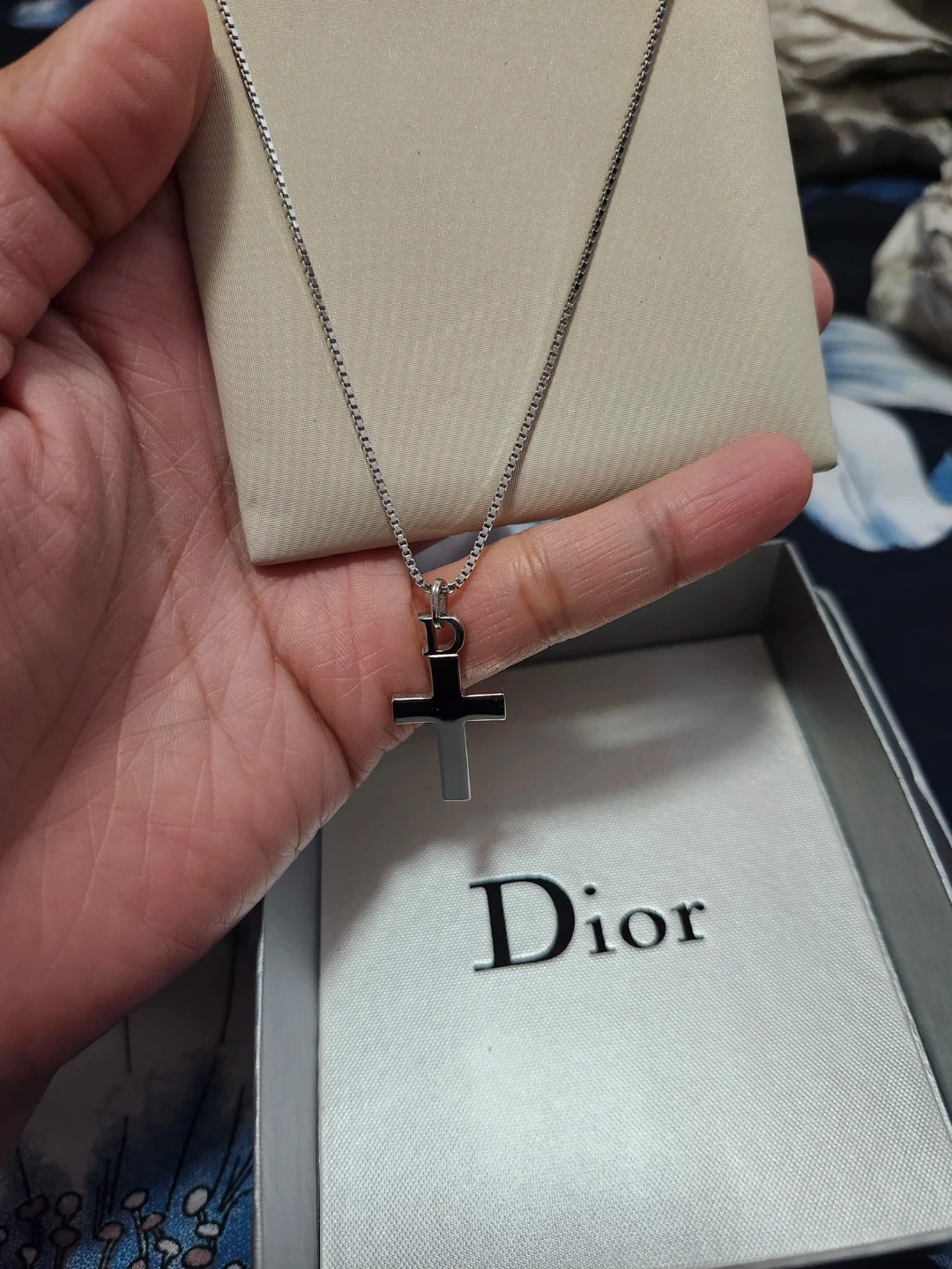 Selling a beautiful Dior silver cross necklace. It's in great condition and comes with the original box. This necklace is a timeless piece that would make a lovely addition to any jewellery collection