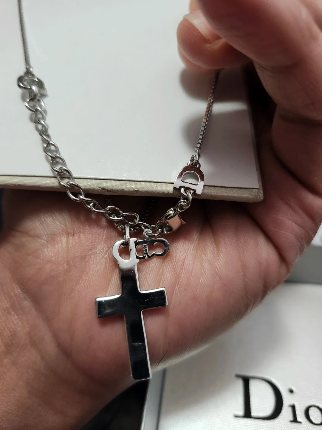 Selling a beautiful Dior silver cross necklace. It's in great condition and comes with the original box. This necklace is a timeless piece that would make a lovely addition to any jewellery collection