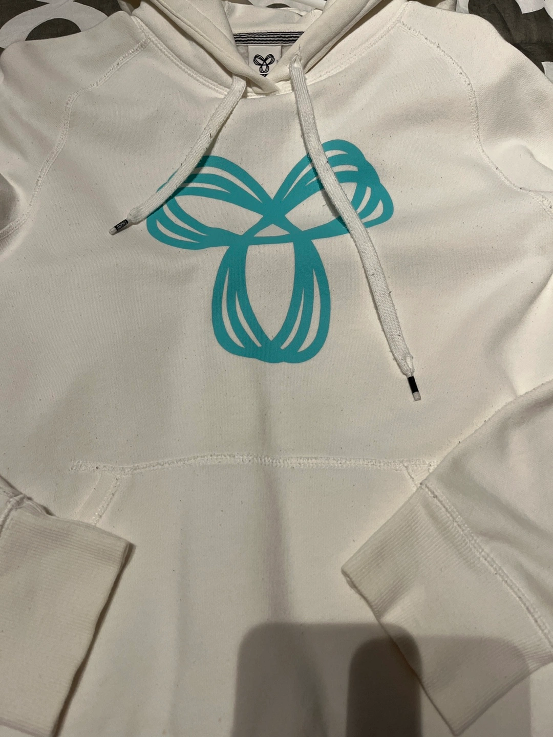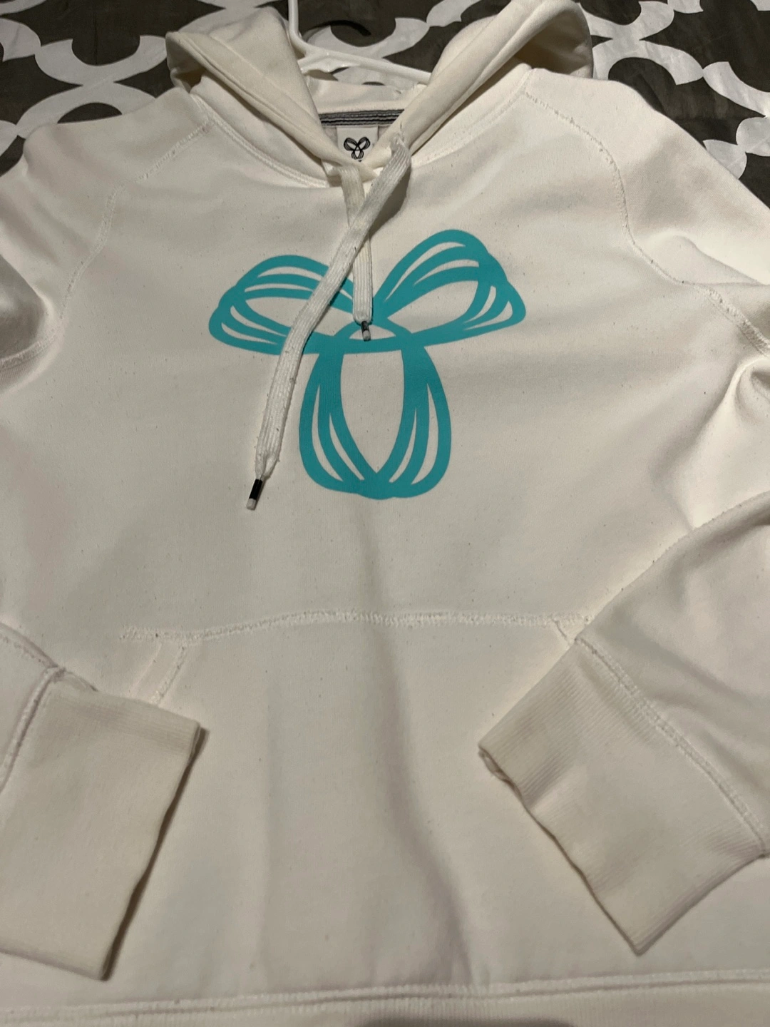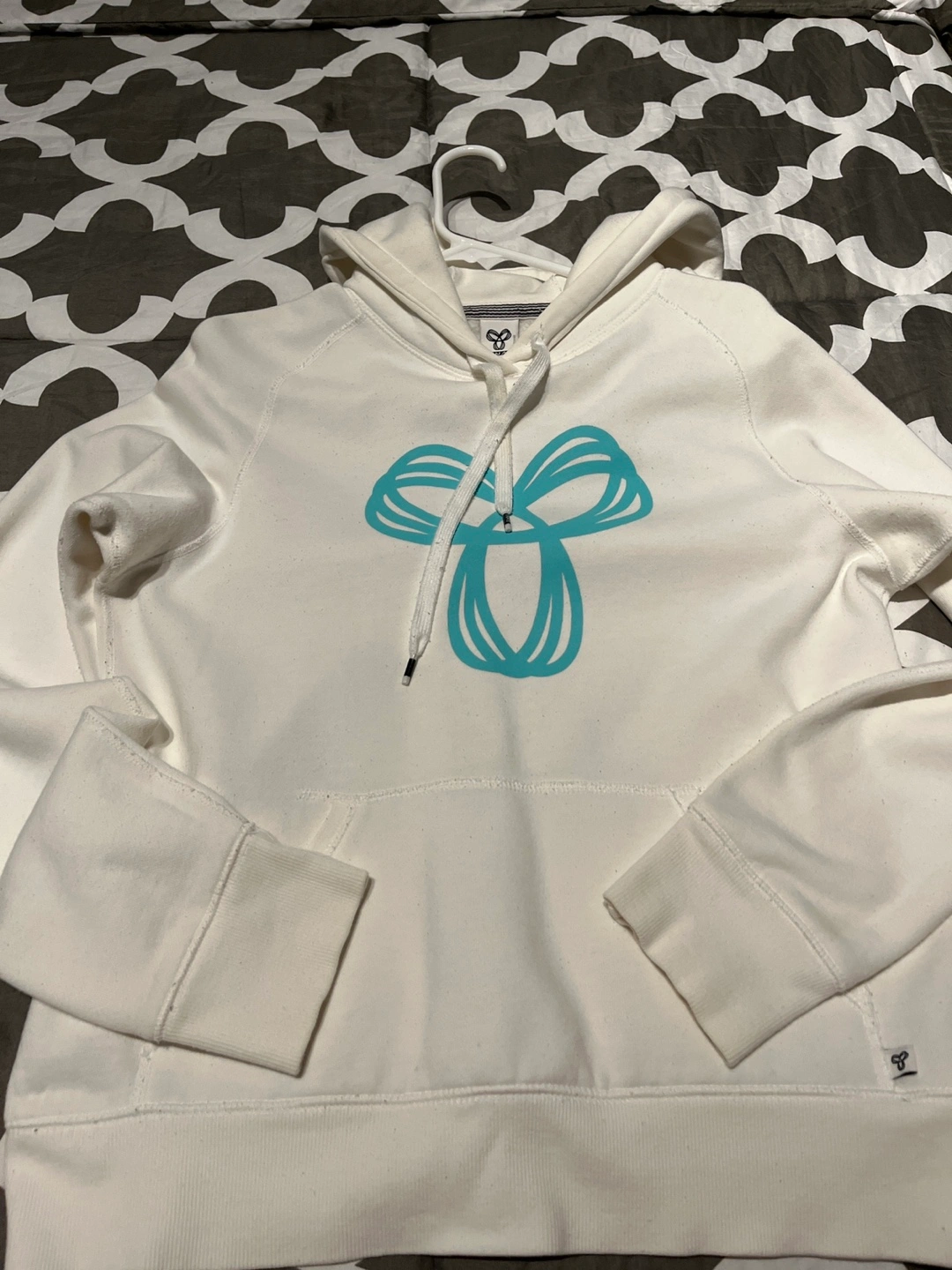 White hoodie with a blue design on the front. Long sleeves and a hood with drawstrings.