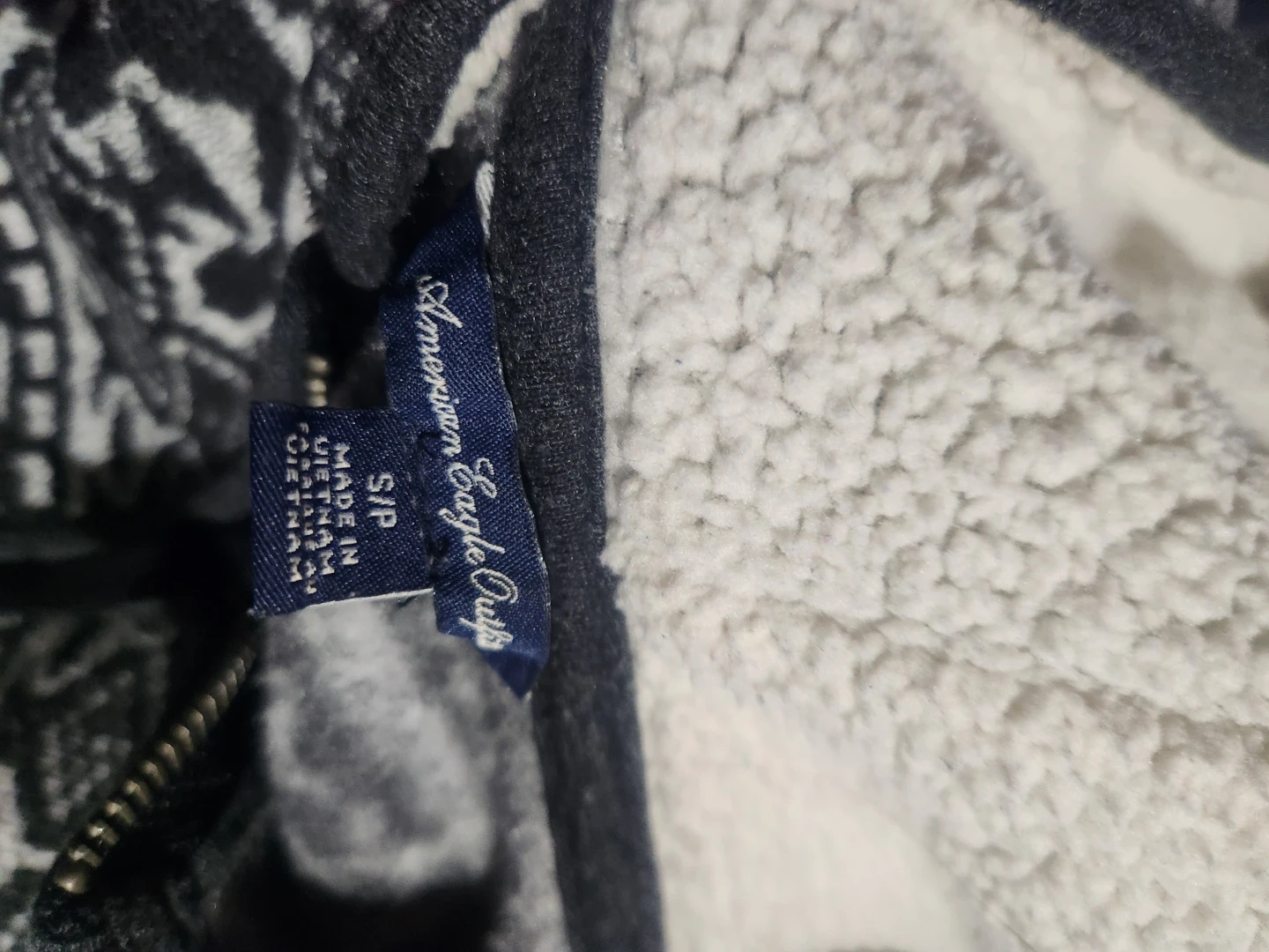 This is a cozy zip-up hoodie from American Eagle Outfitters. It features a black and white patterned knit exterior with a soft sherpa-lined hood and body. Size S/P.