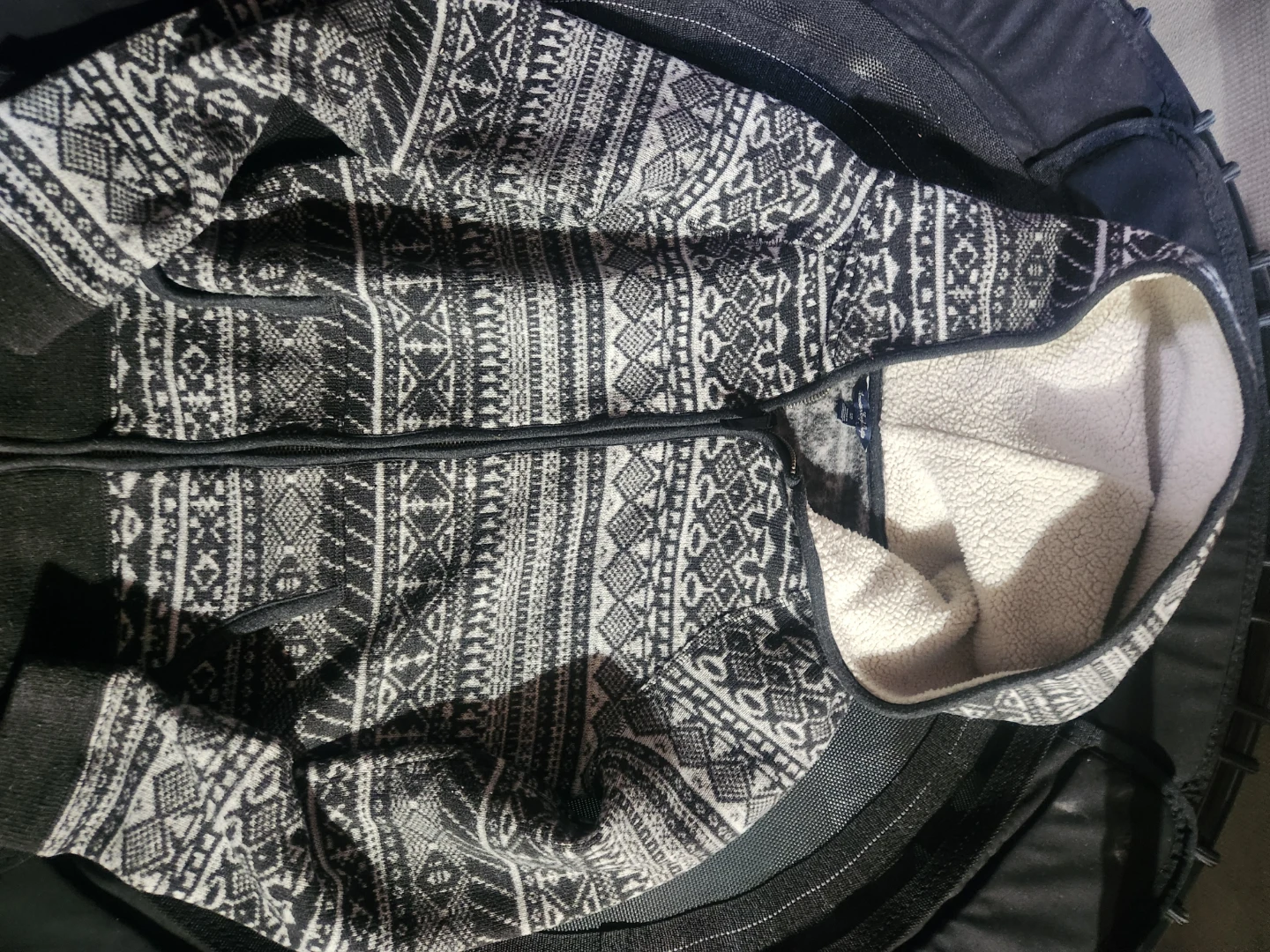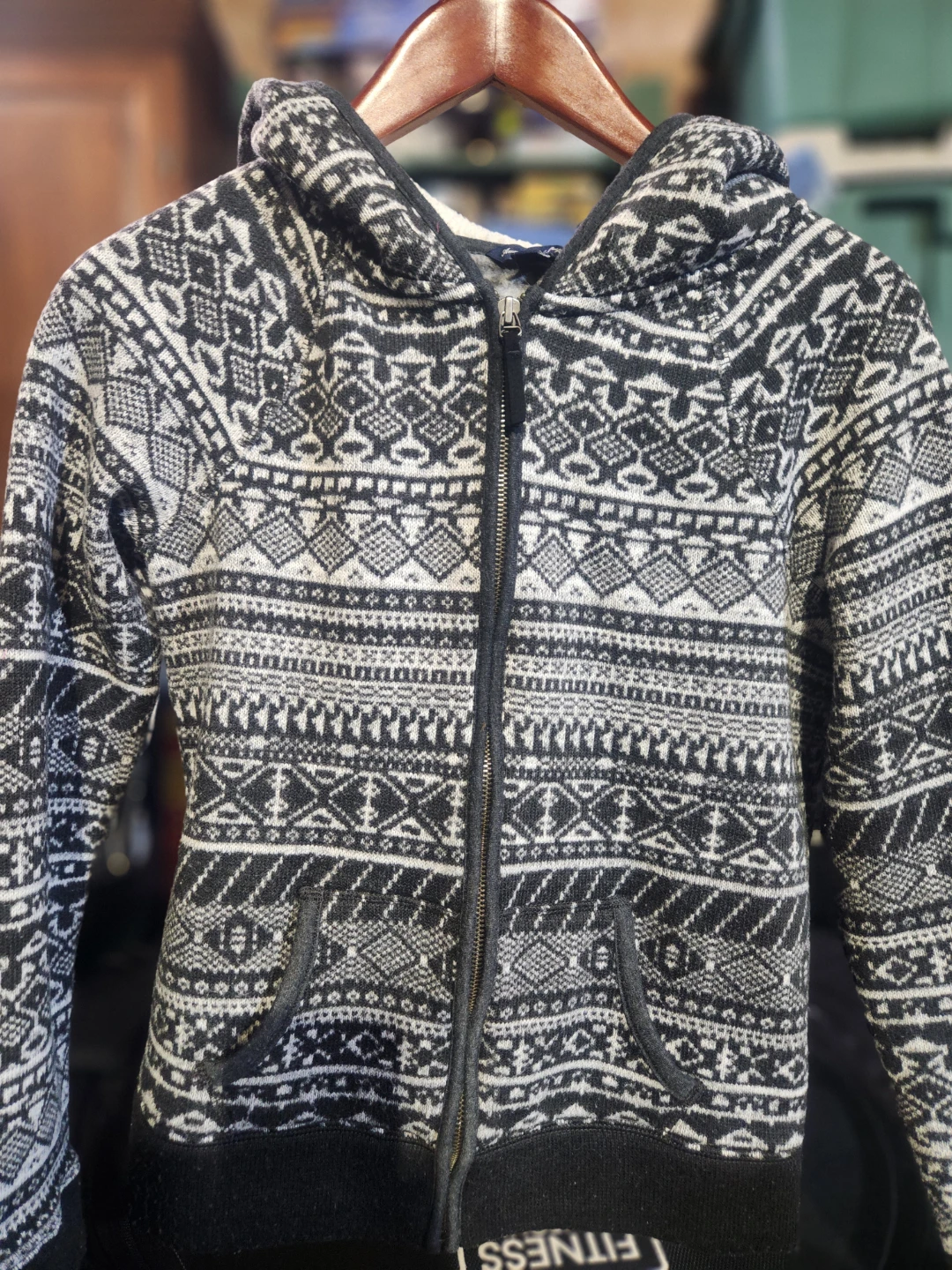 This is a cozy zip-up hoodie from American Eagle Outfitters. It features a black and white patterned knit exterior with a soft sherpa-lined hood and body. Size S/P.