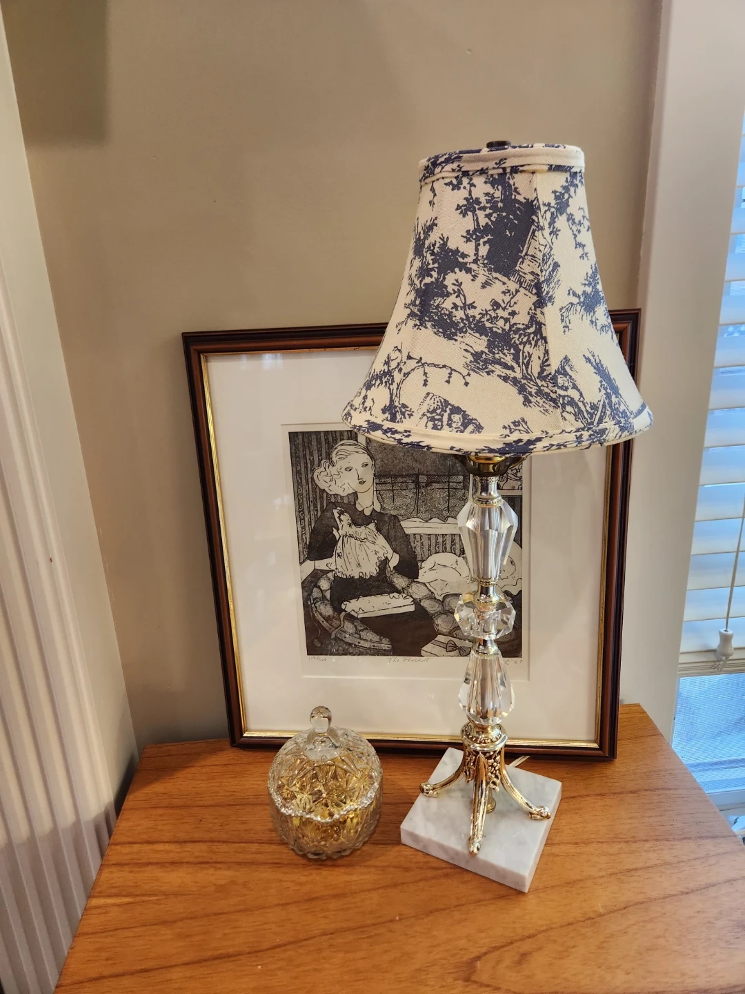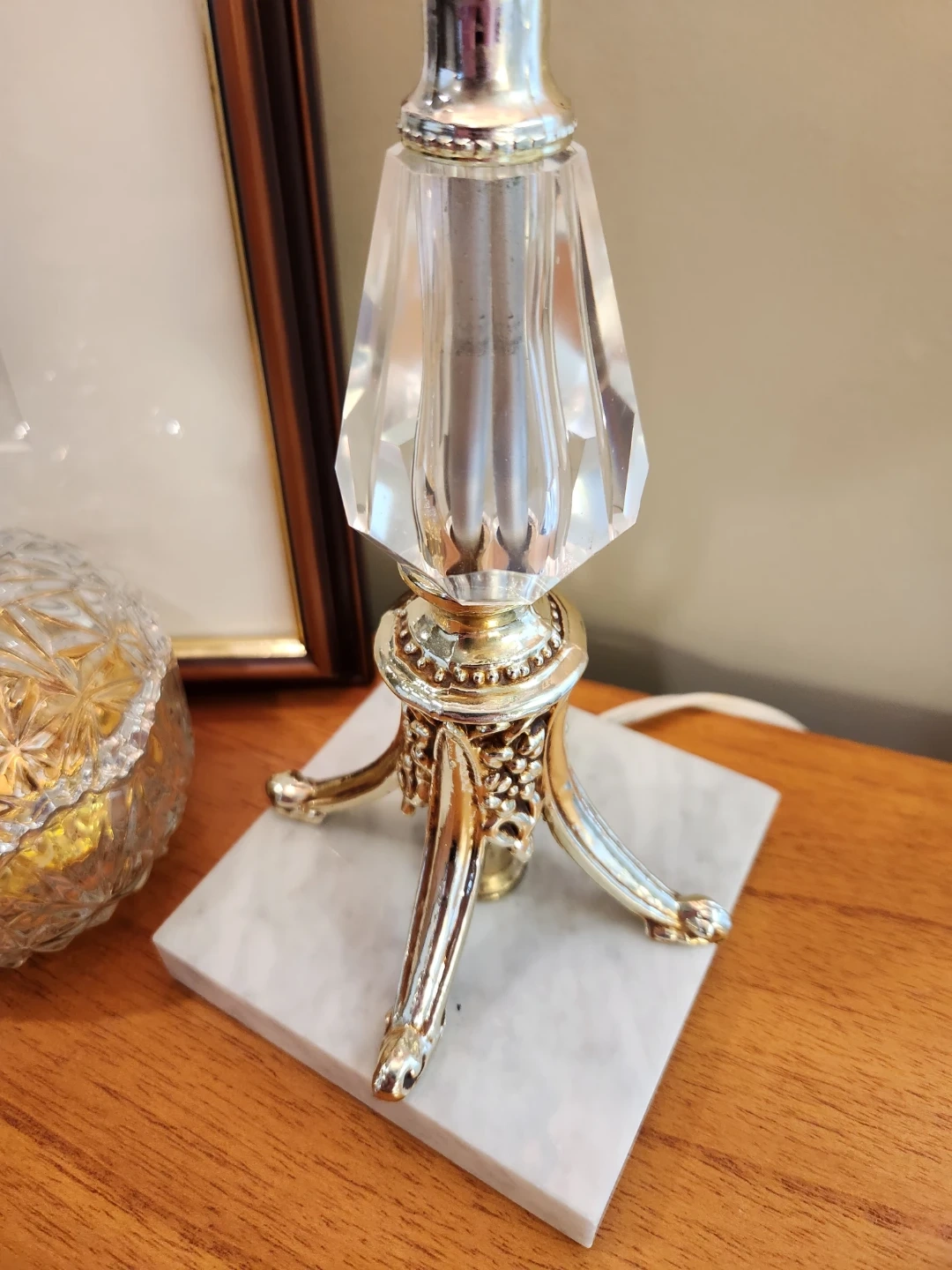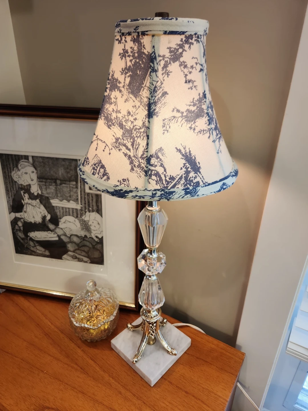 This elegant table lamp features a crystal-look base with metallic accents, and marble base. It's topped with a charming classic tole fabric shade. A great accent piece for any room!