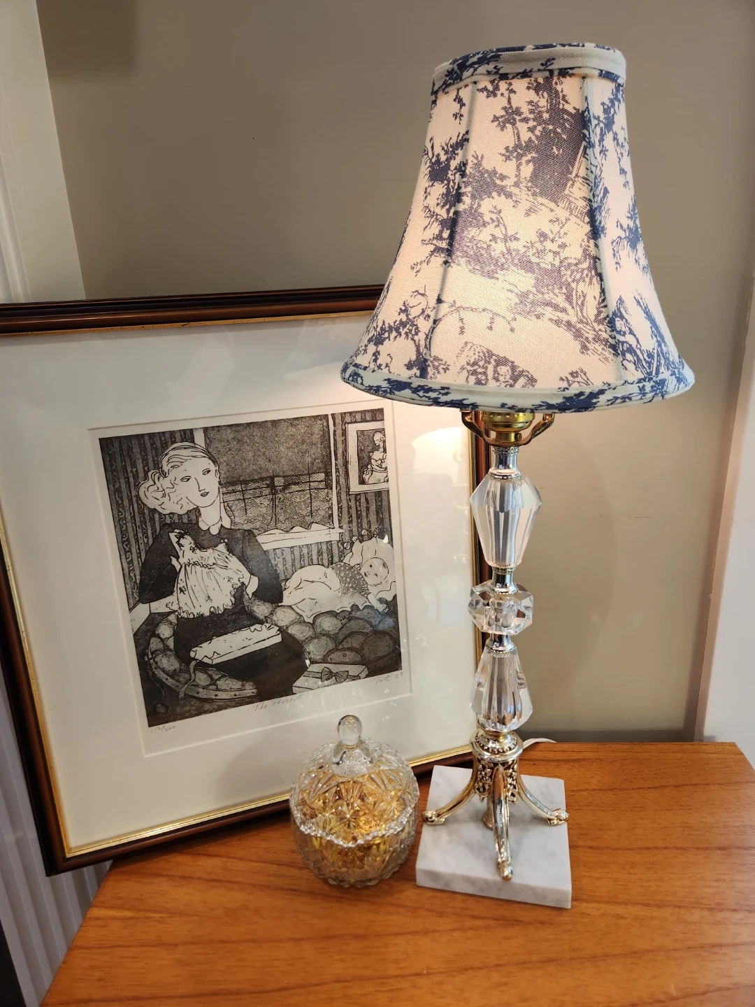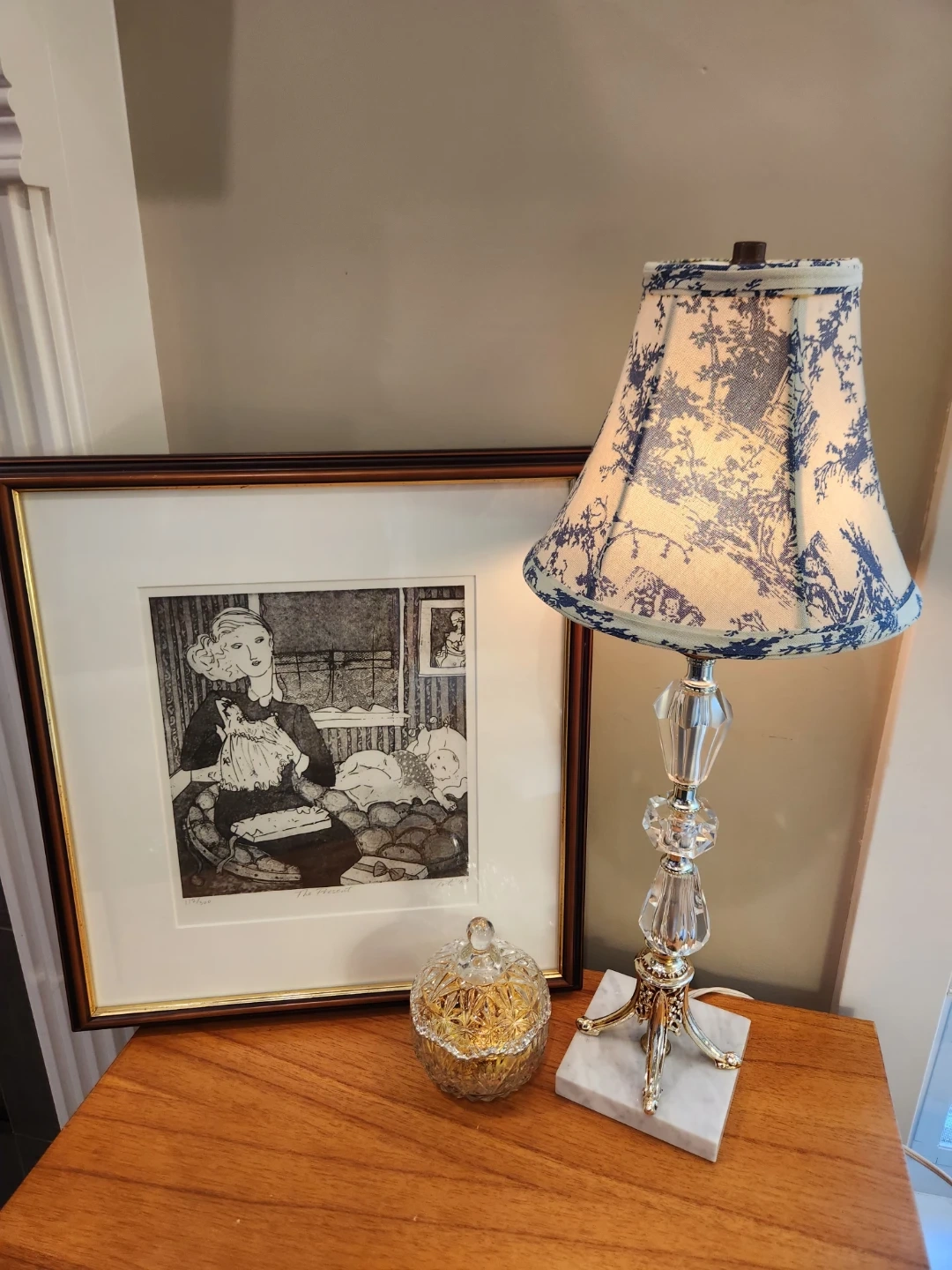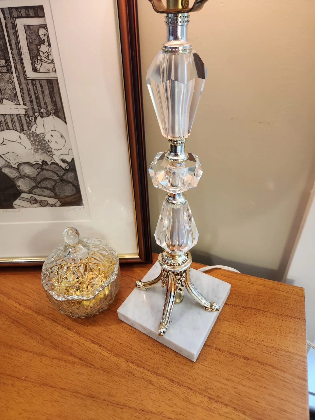 This elegant table lamp features a crystal-look base with metallic accents, and marble base. It's topped with a charming classic tole fabric shade. A great accent piece for any room!