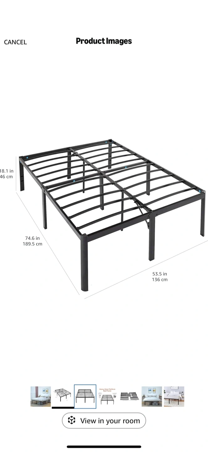 Selling a full-size metal platform bed frame. It's a sturdy and simple design, perfect for any bedroom. The dimensions are approximately 74.6 inches in length and 53.5 inches in width. It's in great condition and ready for a new home!