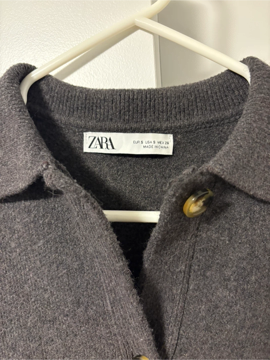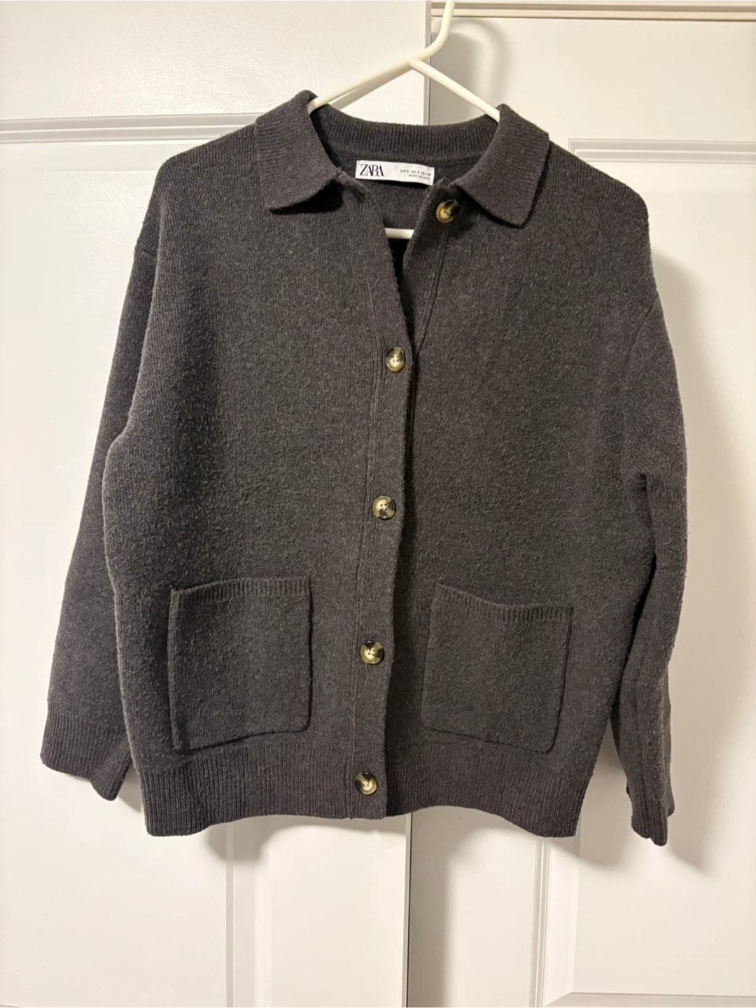 ZARA cardigan sweater. This is a women's size small. It's a dark grey knit with a collared neckline and button-up front. The sweater has two front pockets. Great for layering on cooler days!