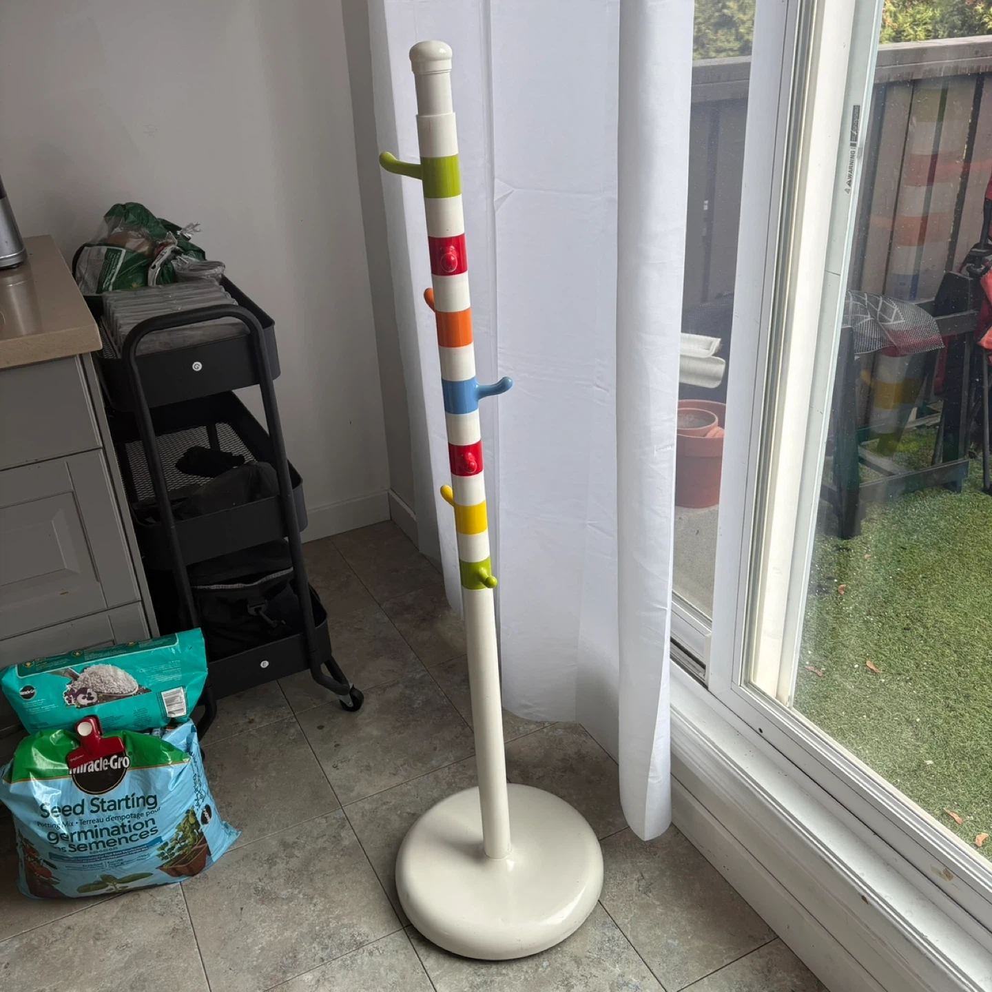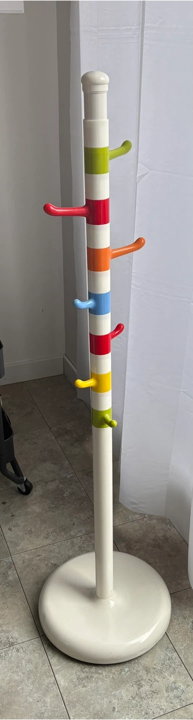 Bright and super cute sturdy rack with hooks that swivel or can be rearranged to your liking.