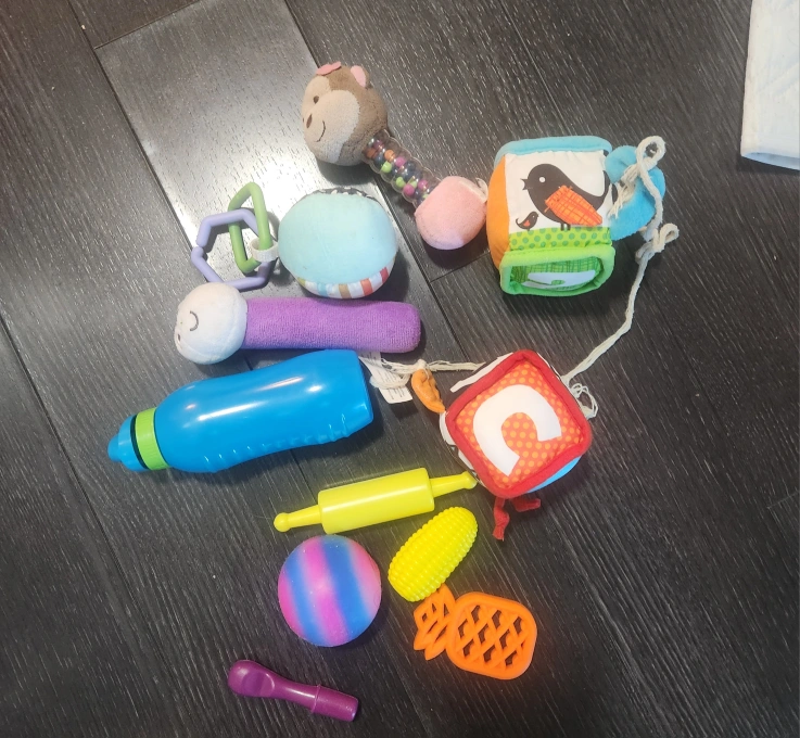 A collection of various baby toys, including a monkey rattle, soft blocks with animal and letter designs, a blue plastic bottle, and other colourful toys for sensory exploration and play