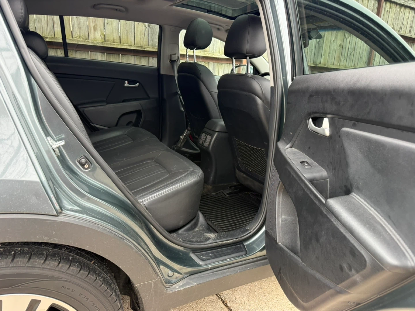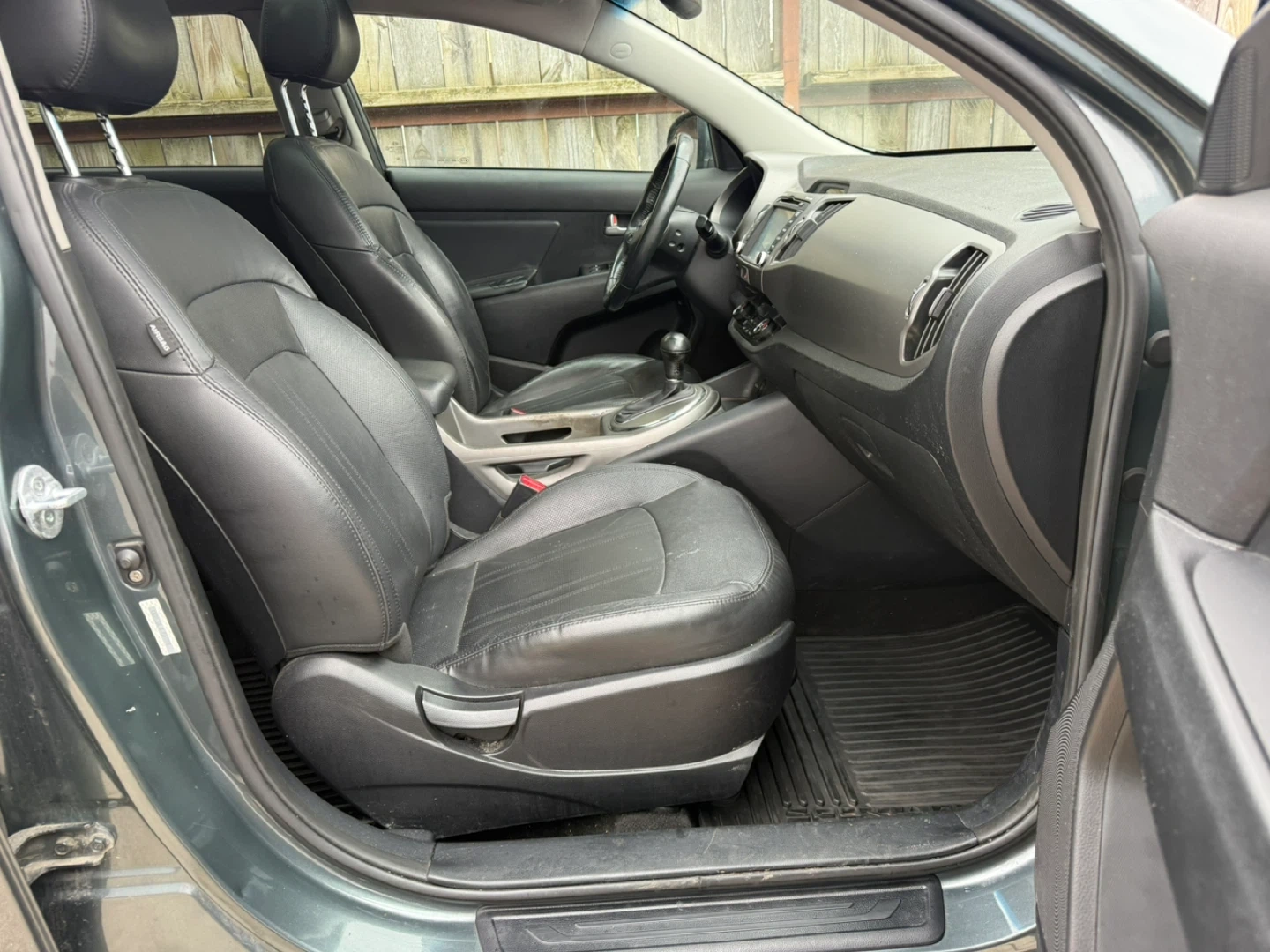 This is a gray Kia Sportage 190,000 original miles SUV with black leather interior. It features a sunroof and has seating for five people. The vehicle is a reliable choice for daily commuting or family trips.
