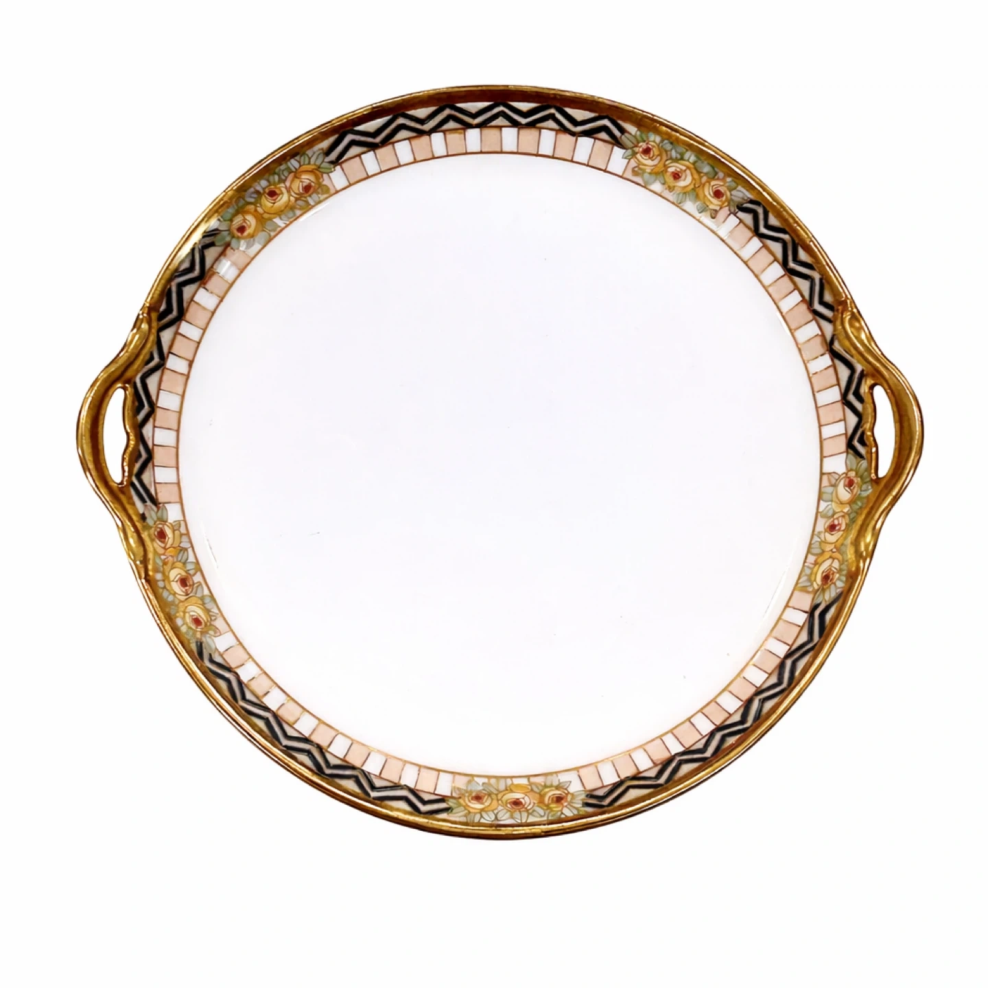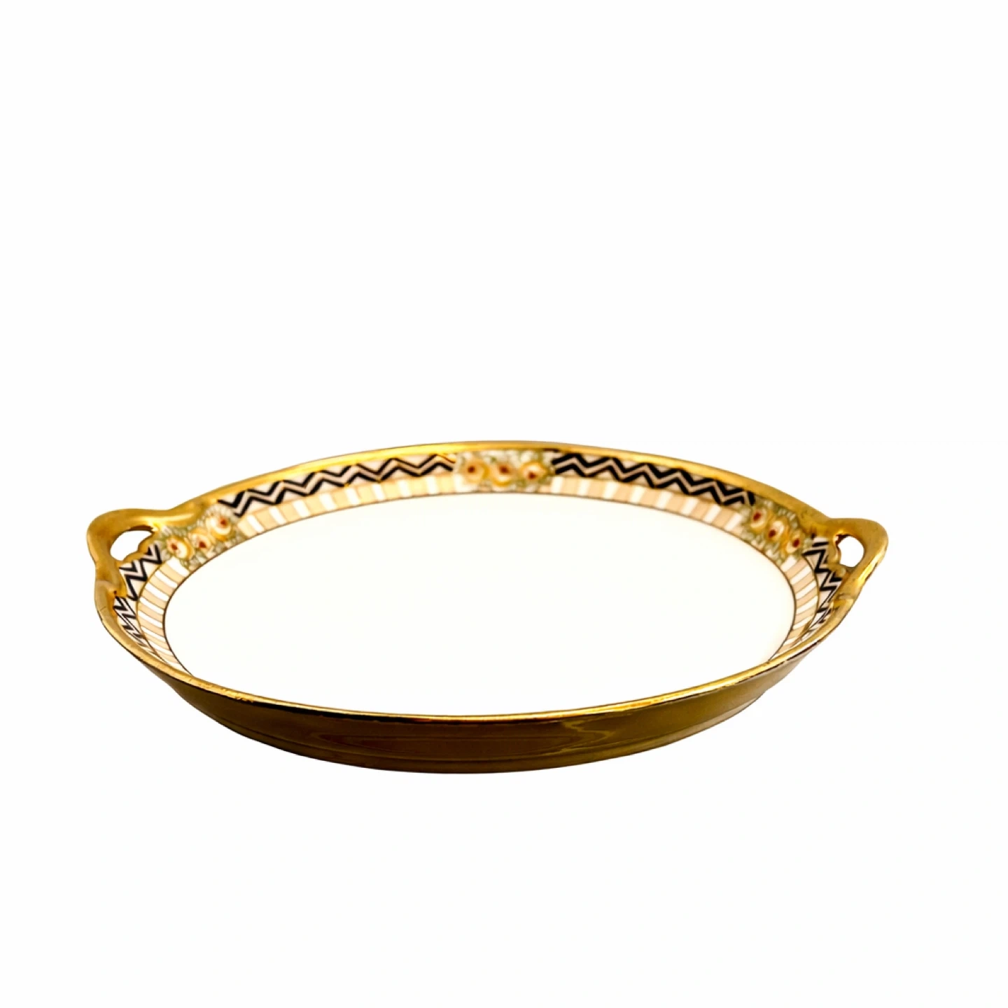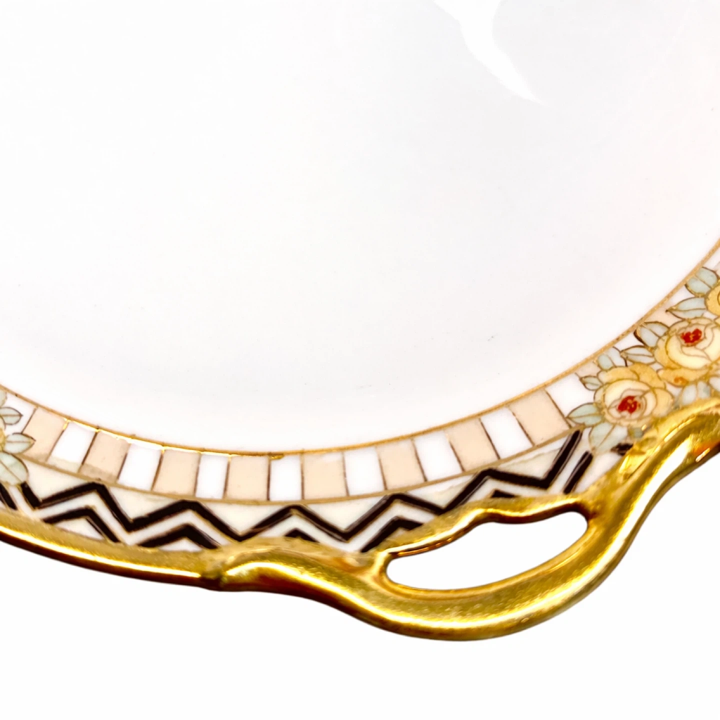 Antique Nippon, RC Nippon, Royal China, Royal Crockery, Japanese export porcelain, hand painted, gilt, gold, handled nappy, bonbon dish, Art Deco chevron, roses, Edwardian, early 20th century Japan