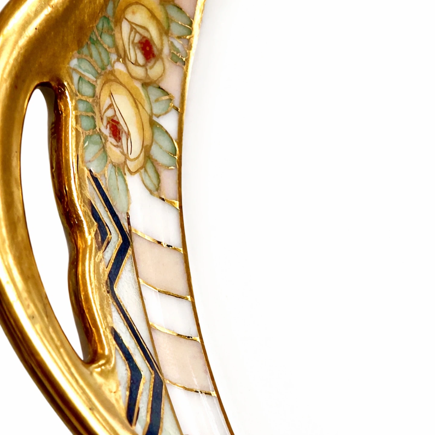 Antique Nippon, RC Nippon, Royal China, Royal Crockery, Japanese export porcelain, hand painted, gilt, gold, handled nappy, bonbon dish, Art Deco chevron, roses, Edwardian, early 20th century Japan