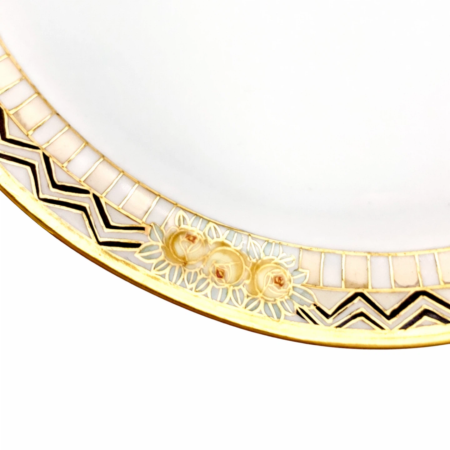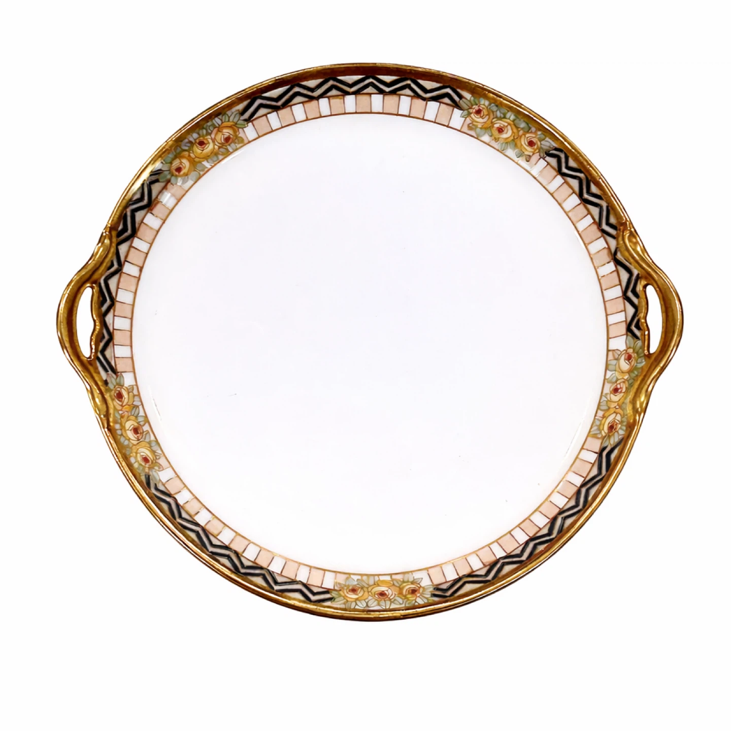 A highly decorative Nippon-era Japanese porcelain handled dish (often referred to by collectors as a “nappy,” bonbon dish, or small handled serving dish) featuring a sophisticated hand-painted border combining Art Deco–leaning geometric chevrons with delicate rose garlands. The piece is finished with generous, bright gold gilt along the rim and integral handles, giving it the rich presentation collectors look for in early 20th-century Japanese export porcelain.