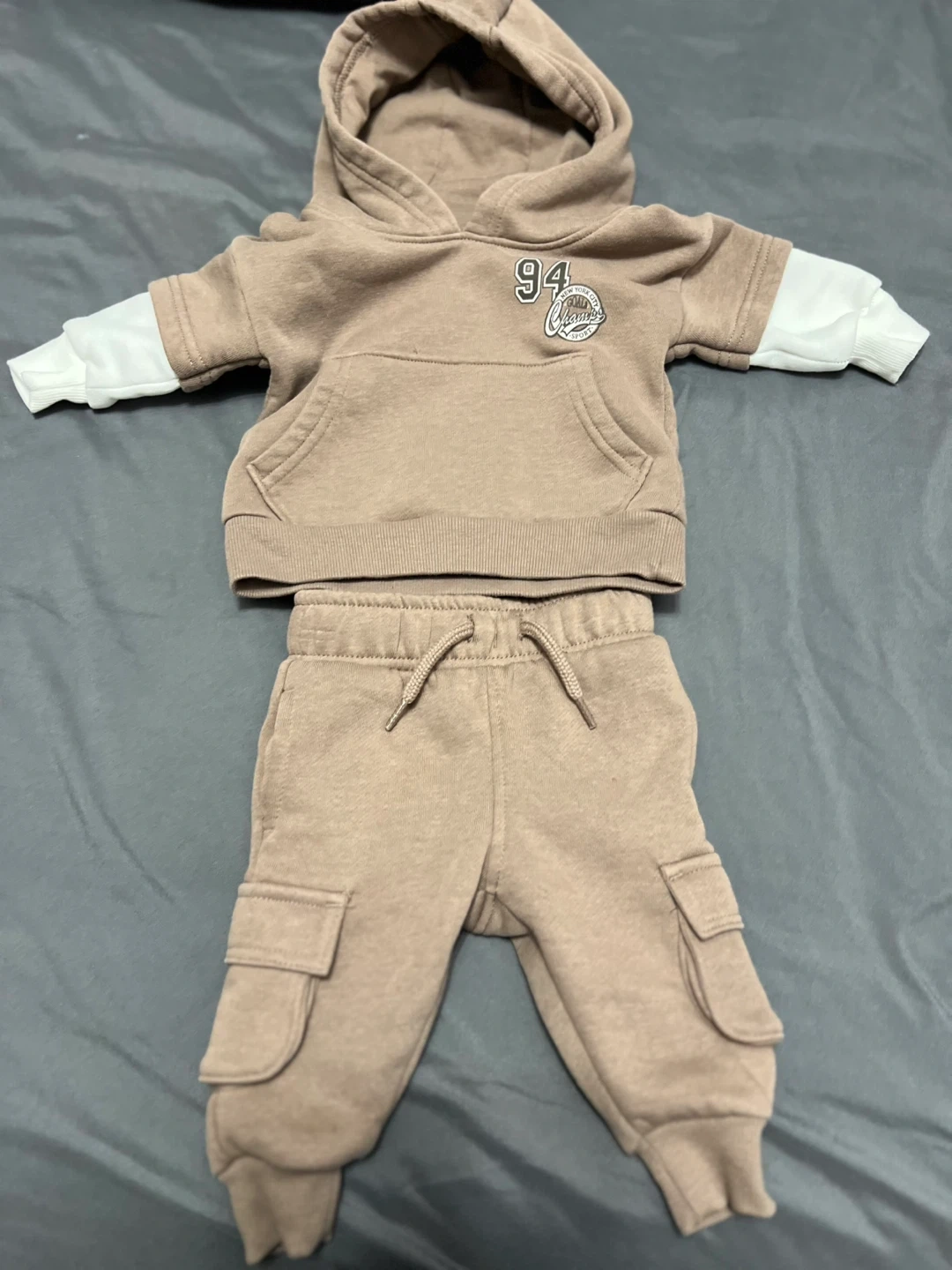 Super cute George Baby outfit in size 0-3 months! The set includes a hoodie and matching pants. It's made of 60% cotton and 40% recycled polyester, so it's soft and comfy for your little one