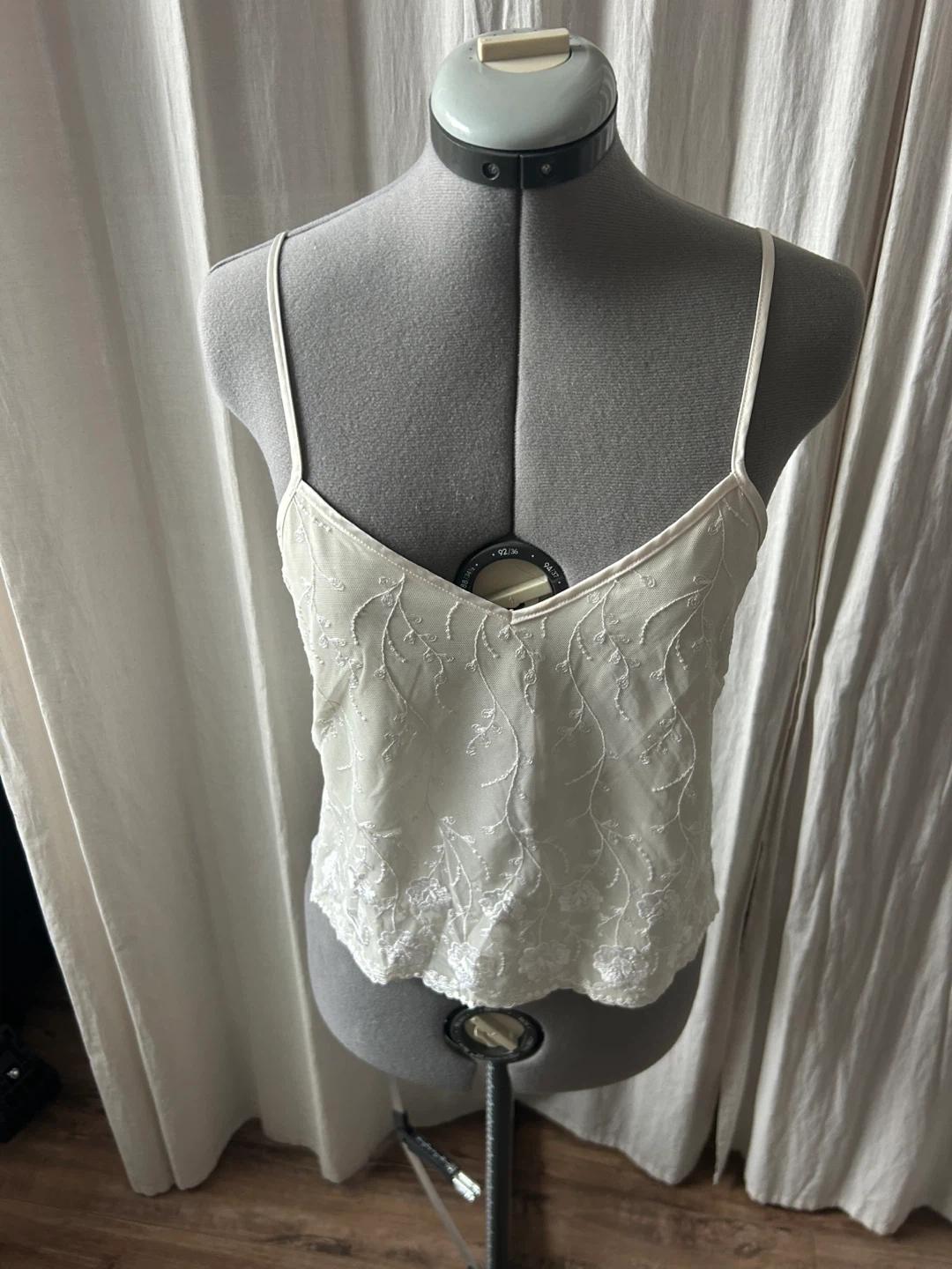 A delicate white camisole top featuring intricate floral lace detailing across the front. It has adjustable spaghetti straps and a satin-like sheen on the back panel. I am moving back to Australia and cannot take everything with me, take a look at my other listings!