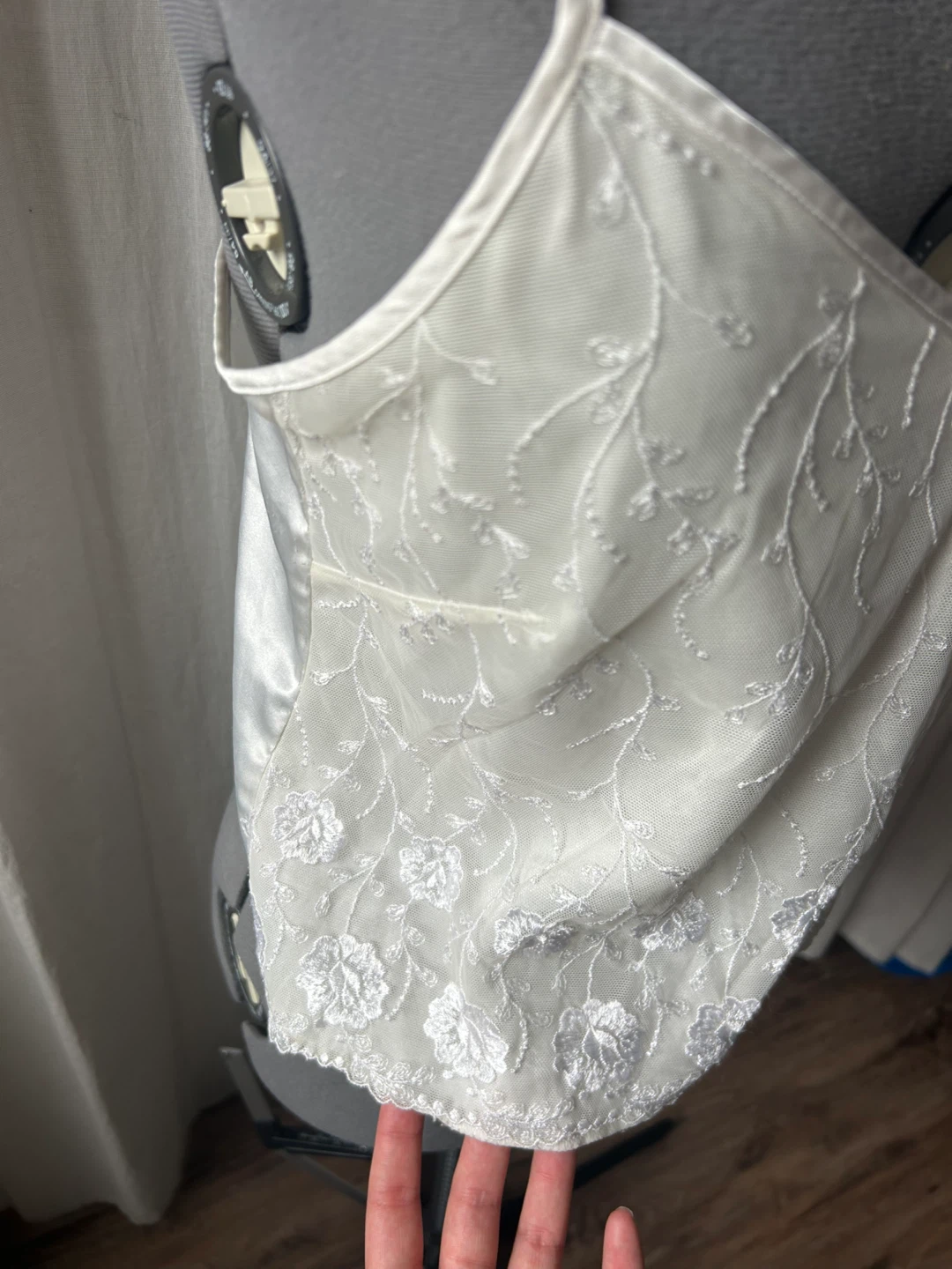 A delicate white camisole top featuring intricate floral lace detailing across the front. It has adjustable spaghetti straps and a satin-like sheen on the back panel. I am moving back to Australia and cannot take everything with me, take a look at my other listings!