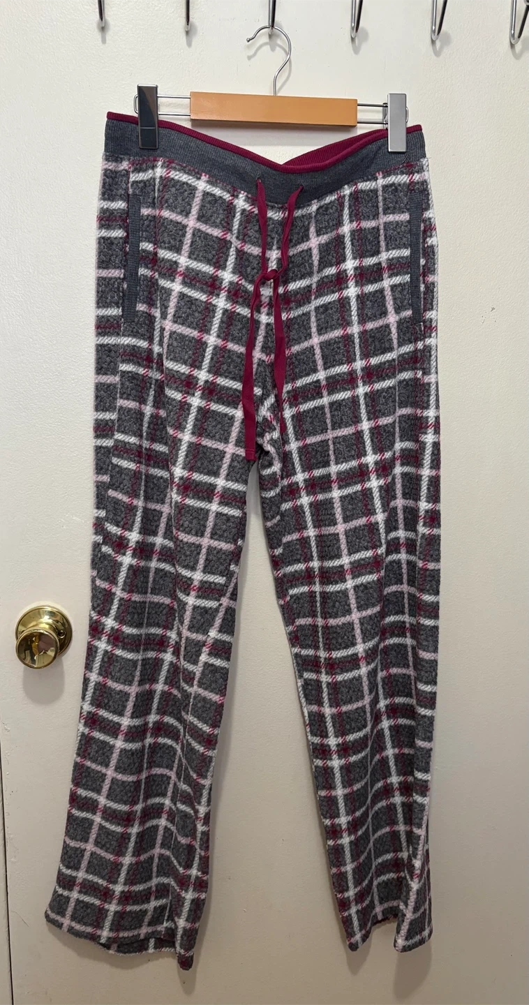 Cozy up with these Nautica pajama pants! They feature a cute plaid pattern in grey, white, and pink with a burgundy waistband and drawstring. These are a size small and perfect for lounging around the house!
