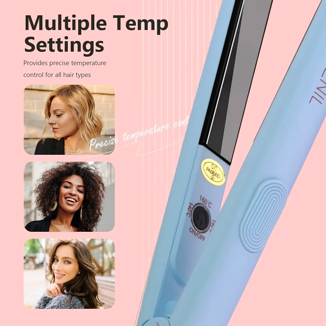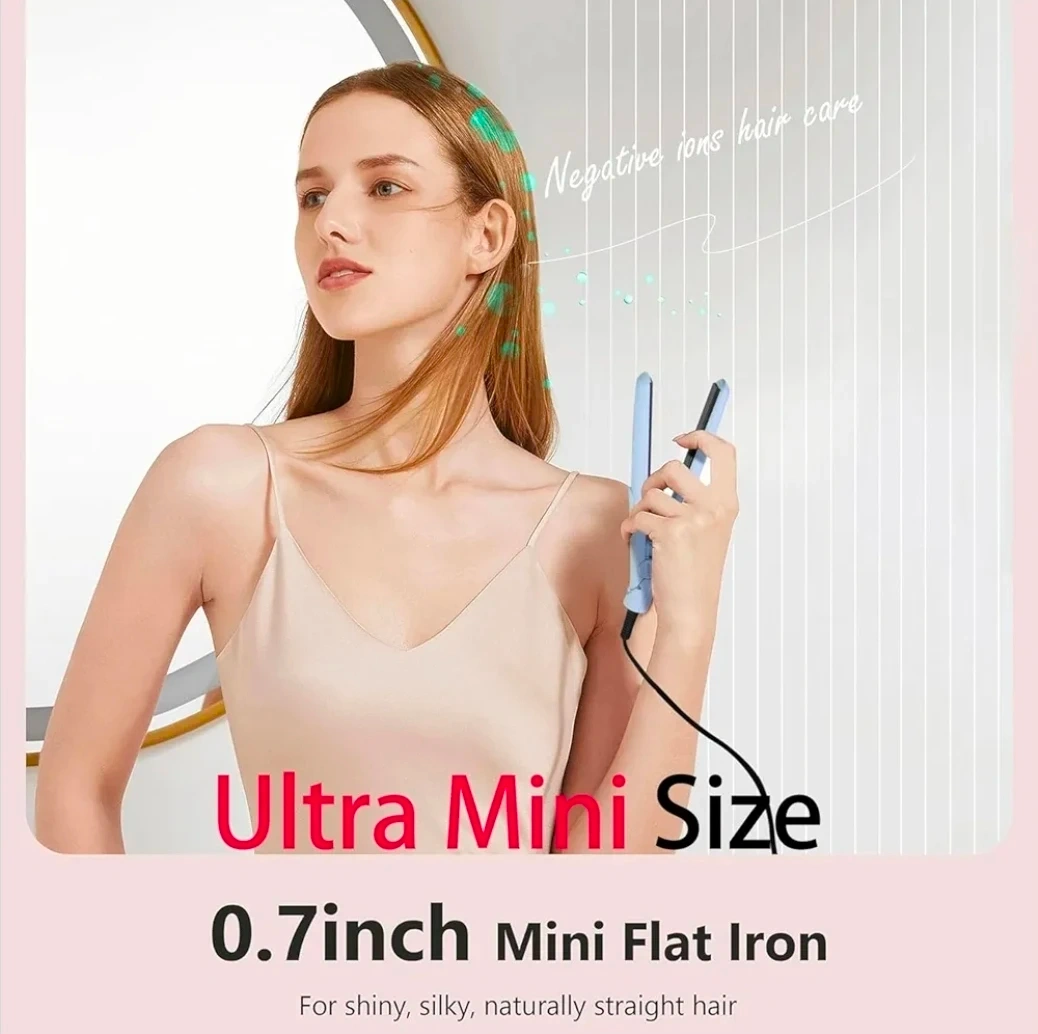 This is an ultra-mini hair straightener, perfect for travel or quick touch-ups. It features ceramic tourmaline plates for smooth styling and offers multiple temperature settings up to 380°F. It's a compact styling tool for naturally straight hair.