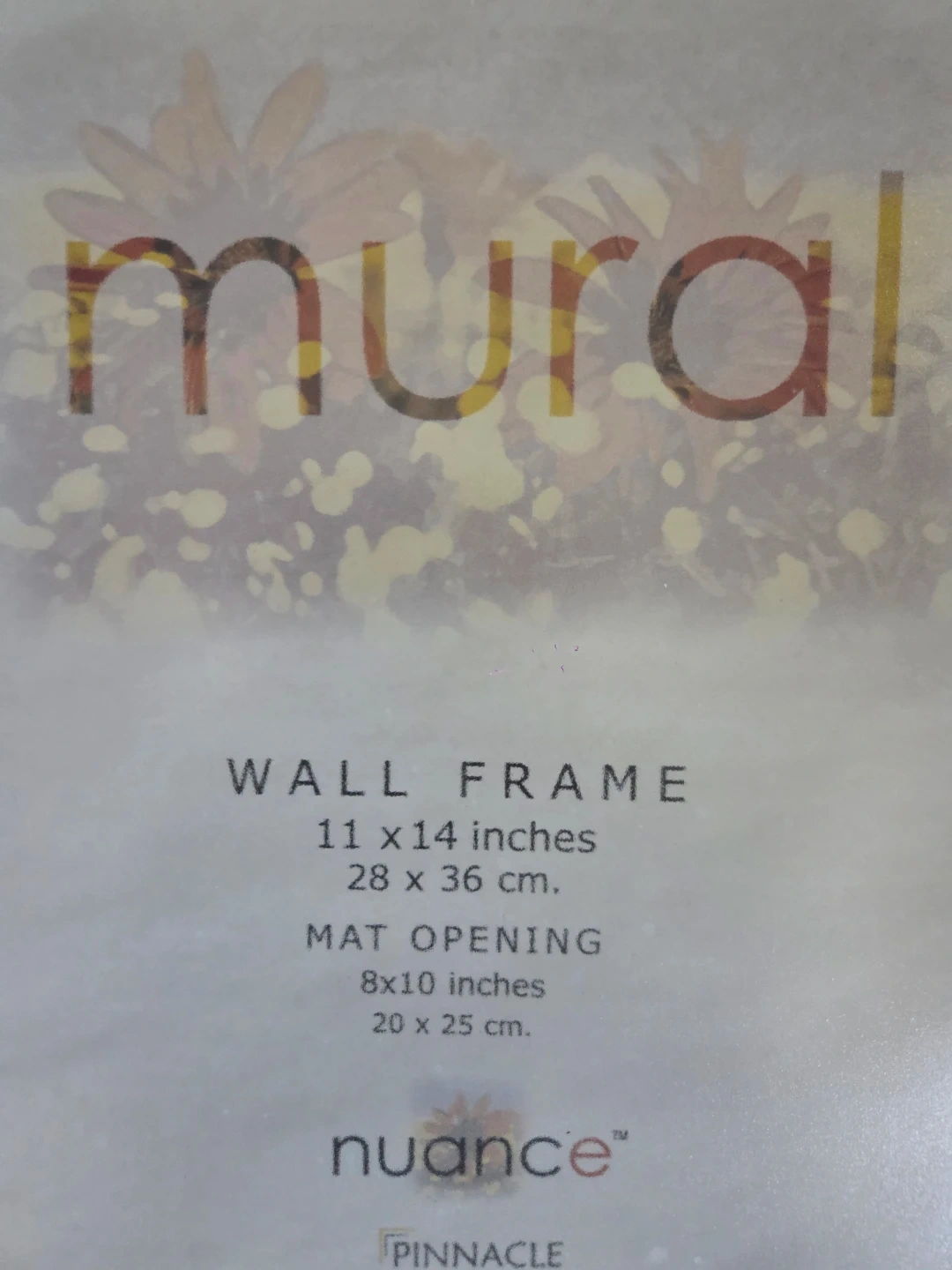 Nuance wall frame for photos. It fits an 11x14 inch display with a mat opening of 8x10 inches. Frame has a gold and dark green finish. Includes backing and hangers.