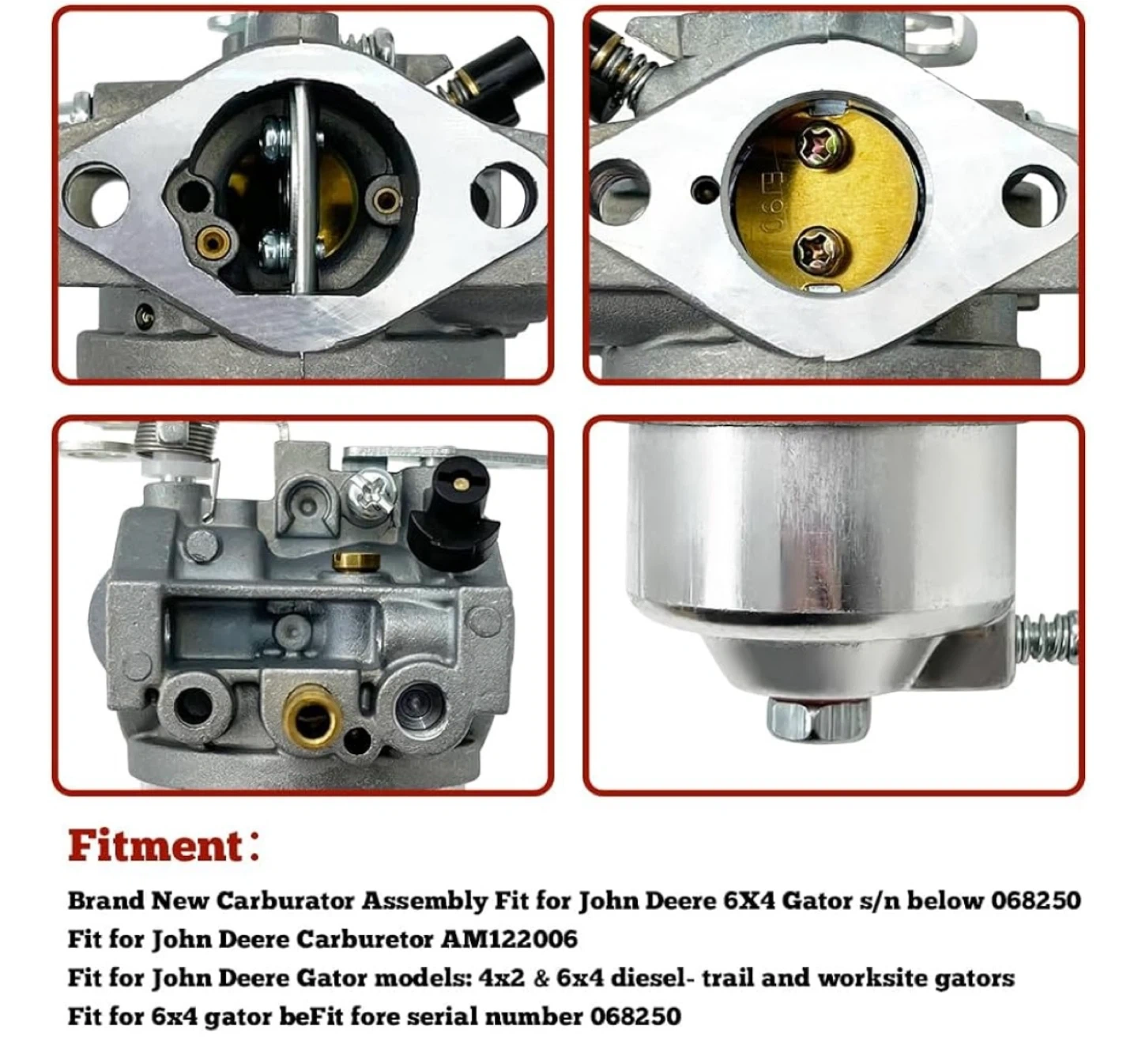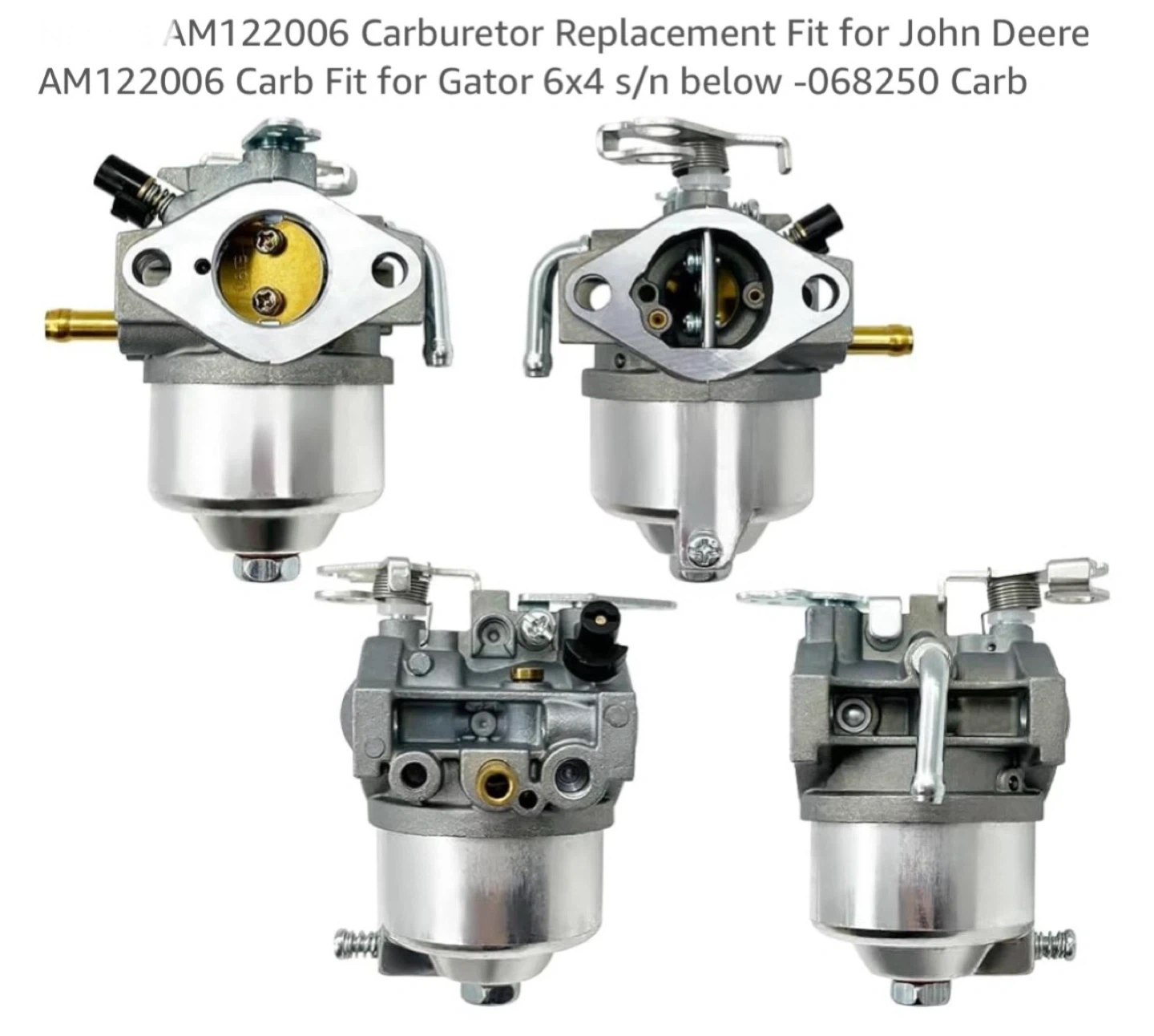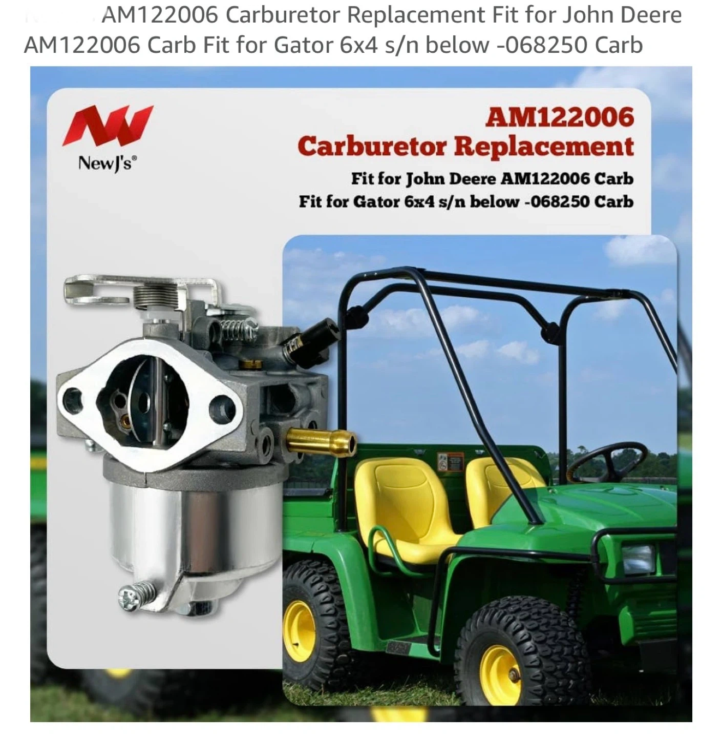 Selling a carburetor replacement, AM122006, designed to fit John Deere 6x4 Gator models. It also fits John Deere Gator models: 4x2 & 6x4 diesel- trail and worksite gators, and 6x4 gator beFit fore serial number 068250. Package includes 1 carburetor and 2 gaskets