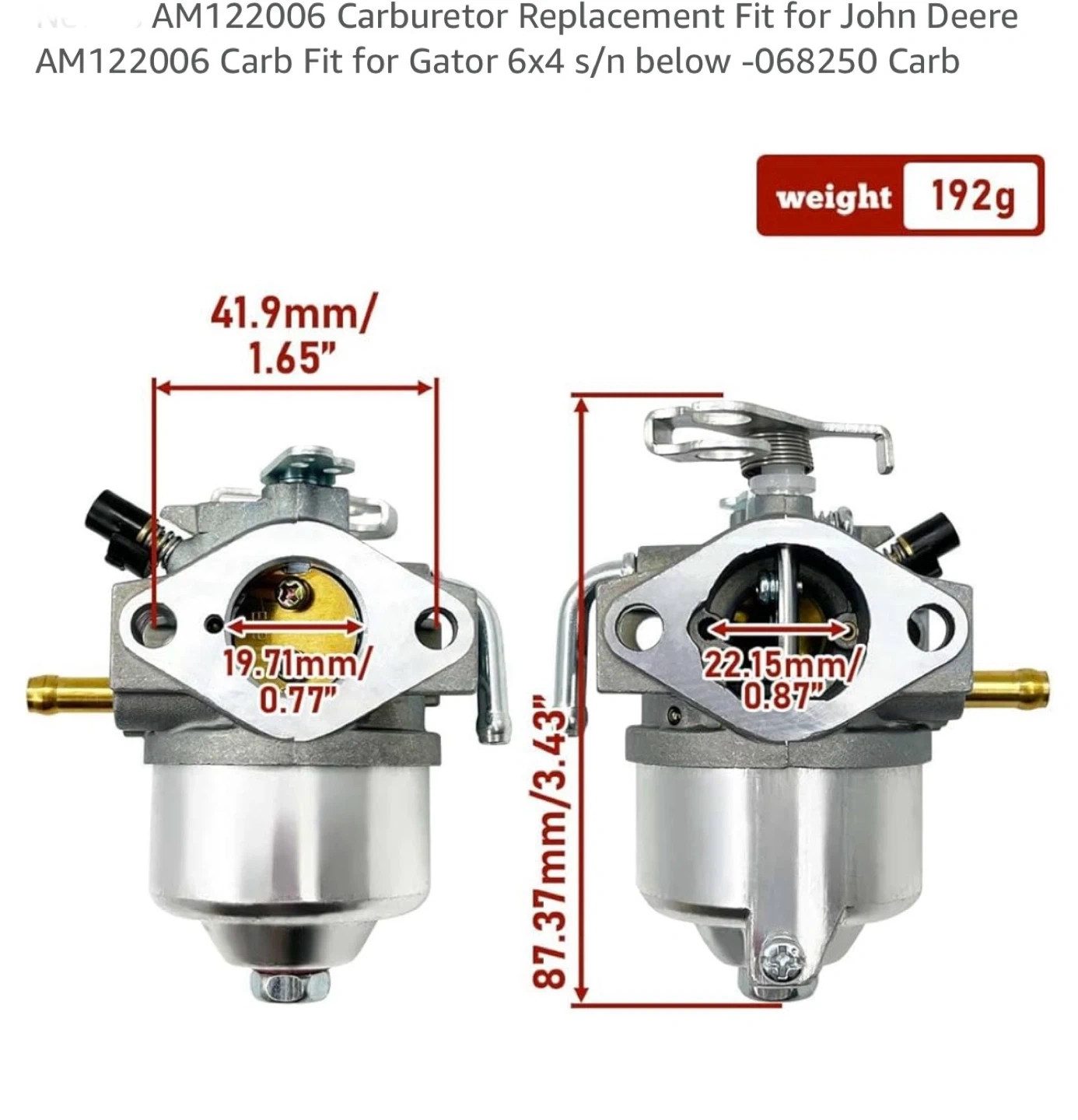 Selling a carburetor replacement, AM122006, designed to fit John Deere 6x4 Gator models. It also fits John Deere Gator models: 4x2 & 6x4 diesel- trail and worksite gators, and 6x4 gator beFit fore serial number 068250. Package includes 1 carburetor and 2 gaskets