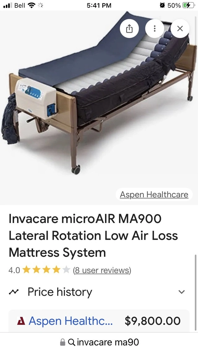 Invacare MA900 alternating low-air-loss mattress for the treatment and prevention of pressure ulcers (bedsores). This mattress has a unique rotation feature that helps move the patient to prevent bed sores. Very good condition. Retails for $10k (see last pic). Add on a Drive Homecare hospital bed for $300 and get free delivery. Mattress only: $800. Mattress and bed: $1100. Features True Low Air Loss Therapy for moisture and temperature control, with inflatable built-in side bolsters. Auto Firm Mode for quick inflation during transfers. Customizable cycle times. Dimensions: 36” by 80” (twin XL). Cash accepted.