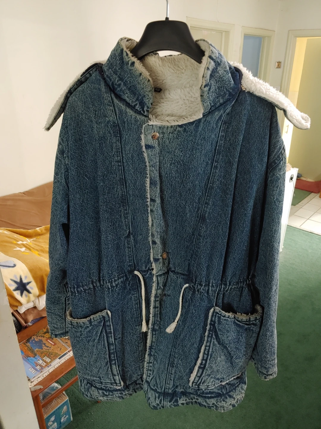 Cozy denim jacket with a sherpa lining to keep you warm during the colder months! It's a size L to XL and features a hood and drawstring waist. Perfect for body protection from cold!