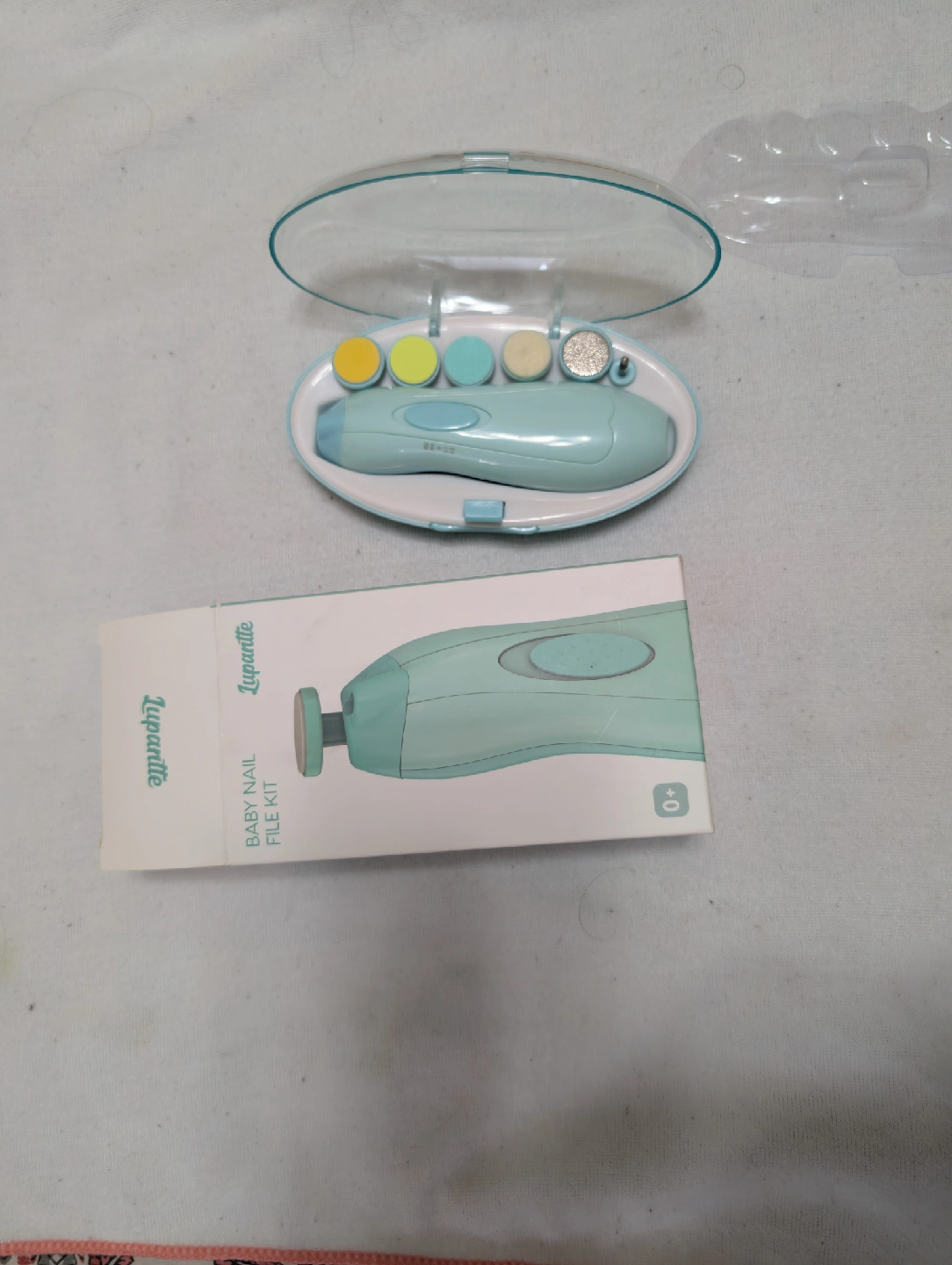 Gently file your little one's nails with this Lupanette baby nail file kit! It comes with different filing heads for various stages and is designed to be safe for delicate skin. The kit includes the main unit and several attachment heads, all in a handy storage case