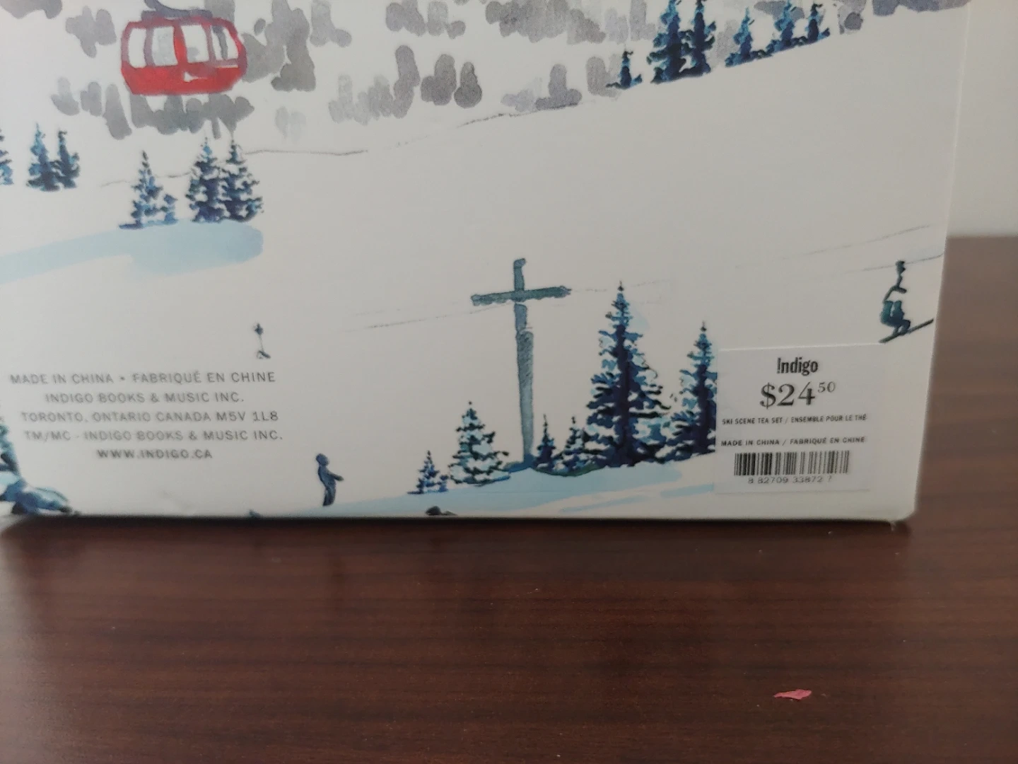 Selling a brand new Indigo Ski Scene Tea Set! It includes a wooden tray, mug, and infuser, all in the original box. The mug features a cute winter ski scene with Canadian flags.