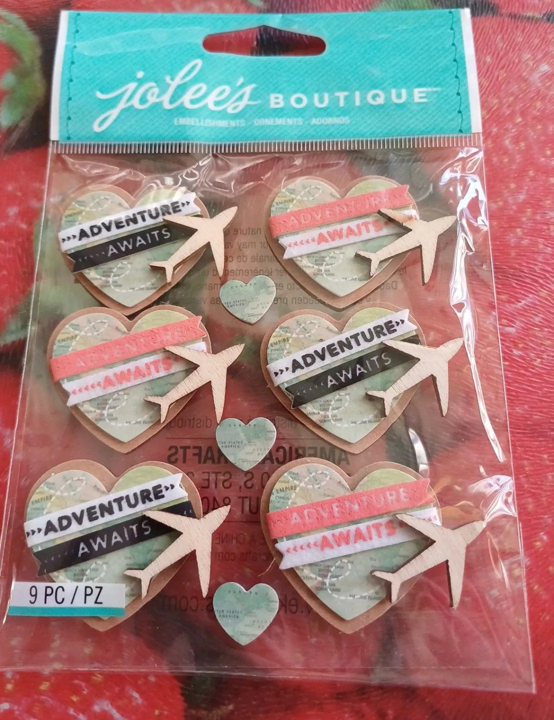 These Jolee's Boutique embellishments are perfect for adding a touch of adventure to your crafts! Each piece features a heart with a map design, an airplane, and the words 'Adventure Awaits'. There are 9 pieces in total, ready to add a unique touch to your scrapbooking, card making, or other creative projects