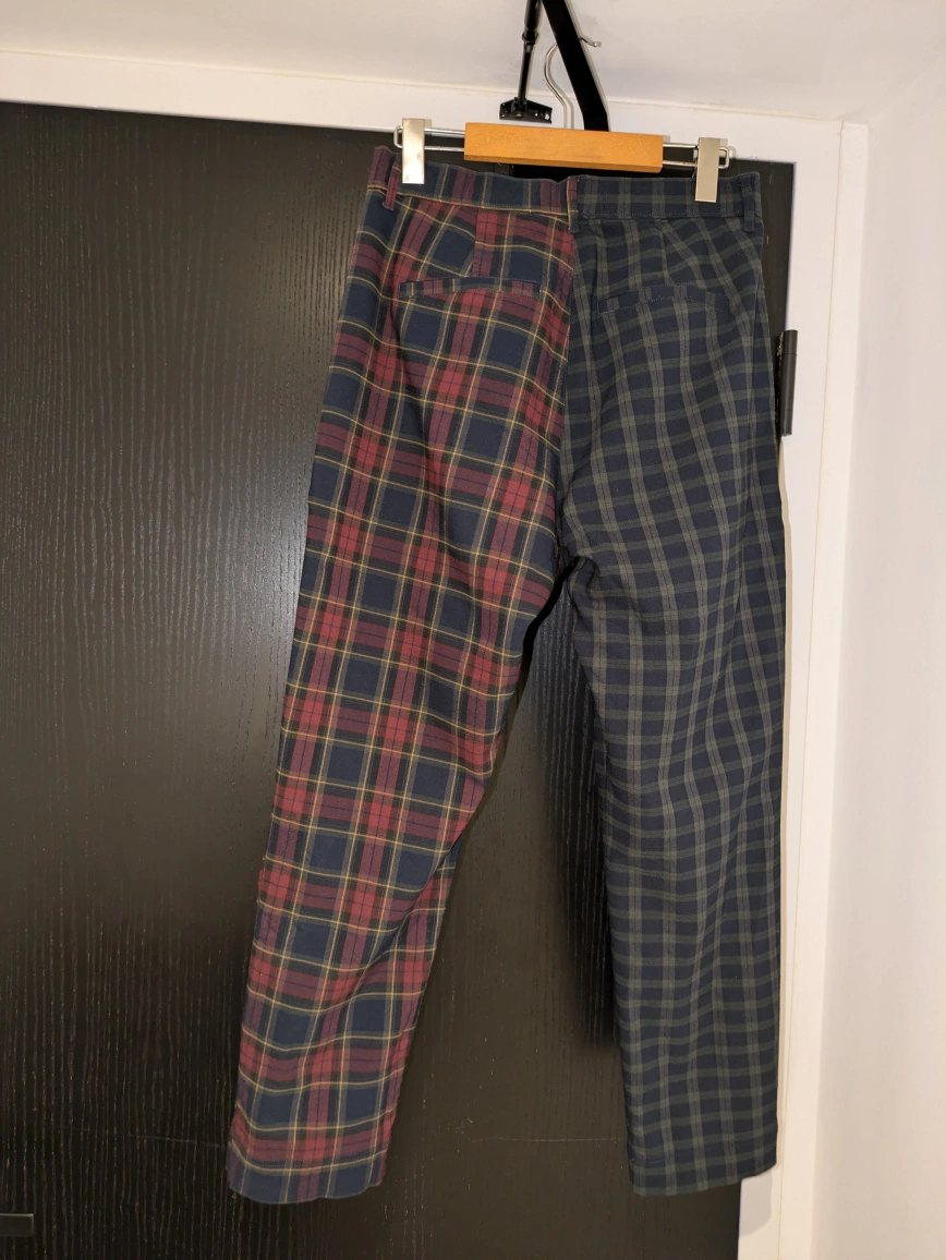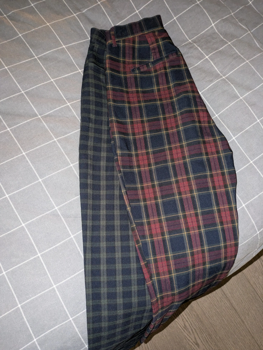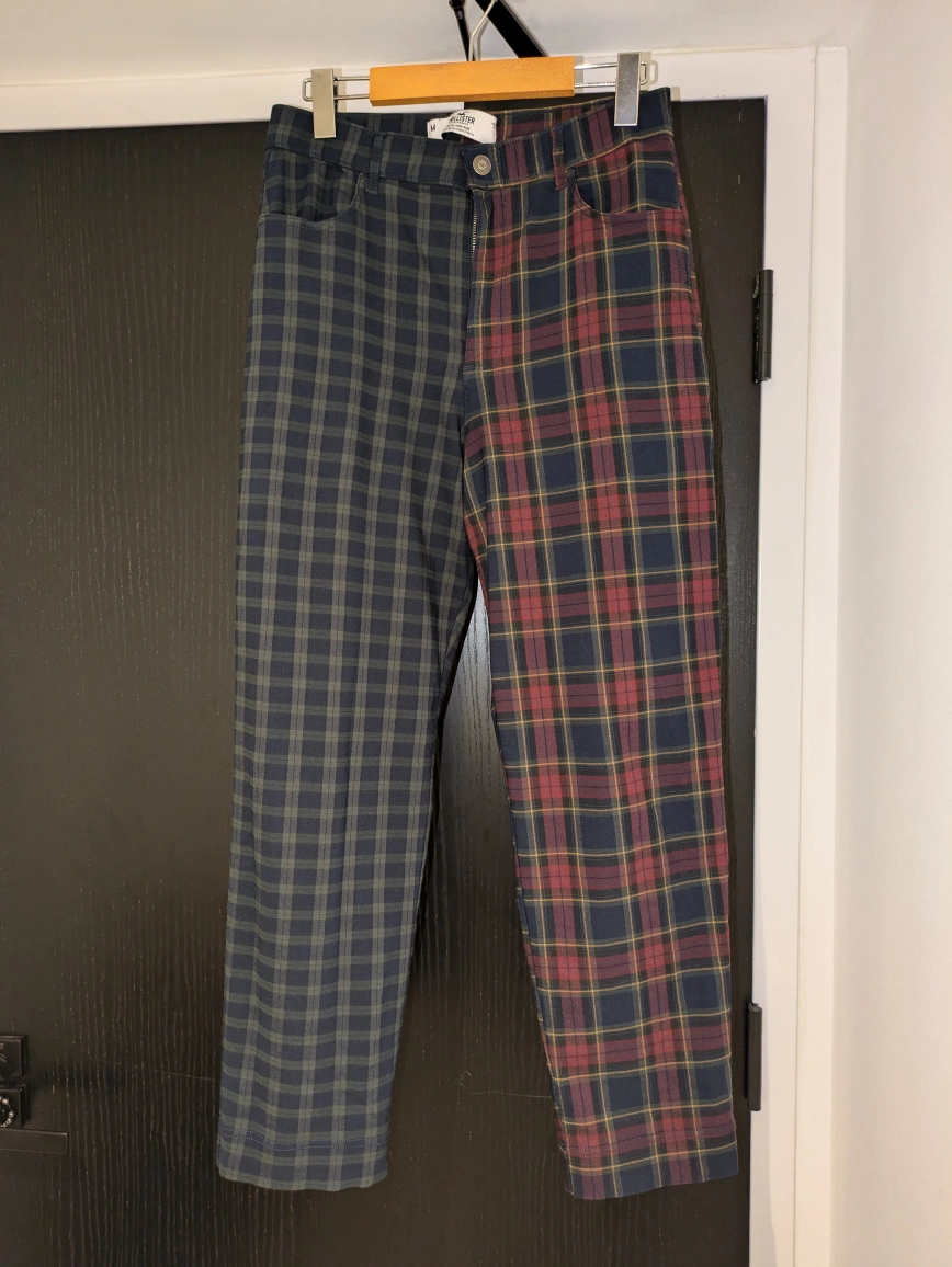 These are a pair of plaid pants with one leg a dark blue and green plaid and the other leg a dark blue, red and yellow plaid. Women's size M. Stretchy and comfortable.