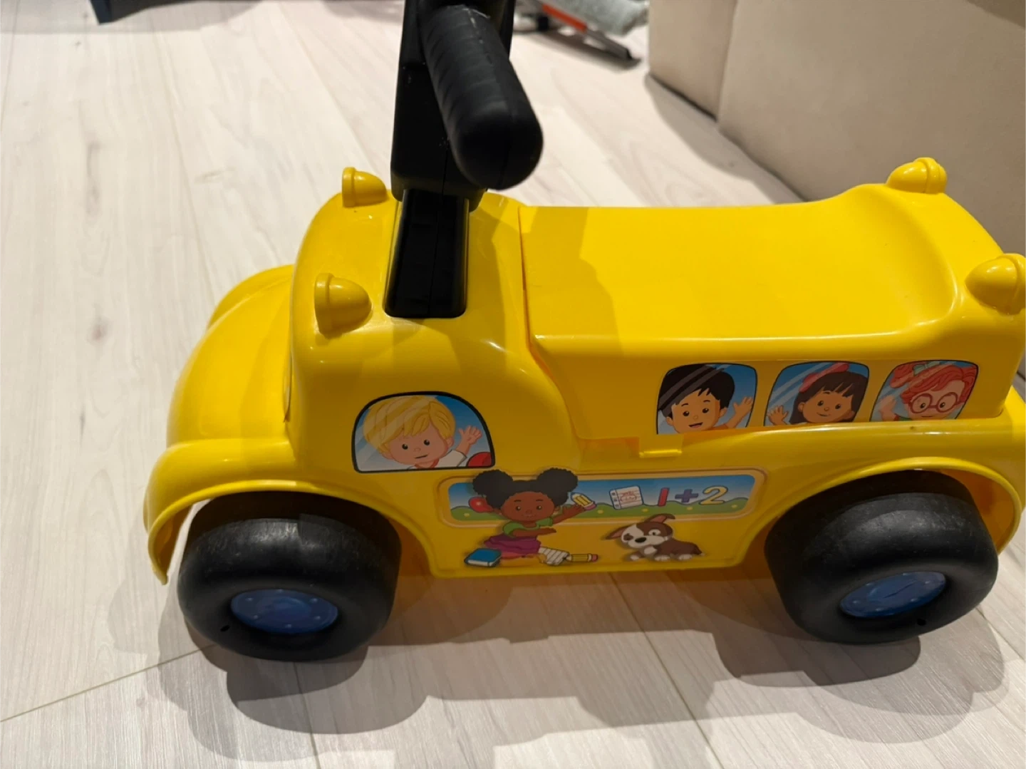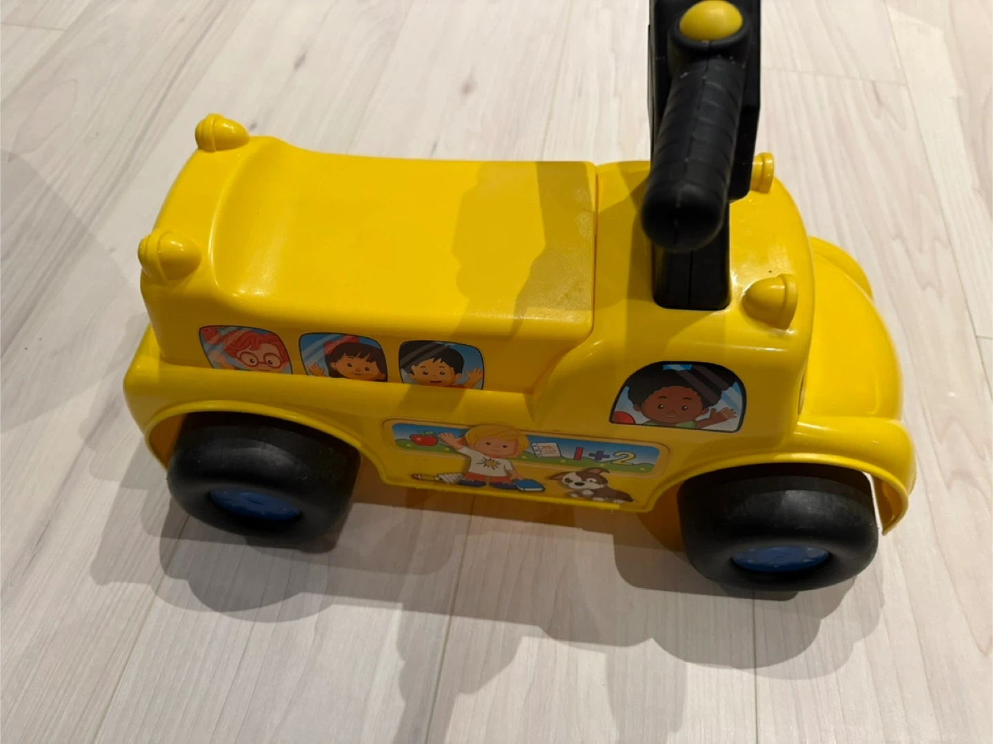 Yellow Little People school bus ride-on toy. It has colourful decals of children and a dog. This ride-on toy is designed for young children to push or ride on. It's great for developing gross motor skills!