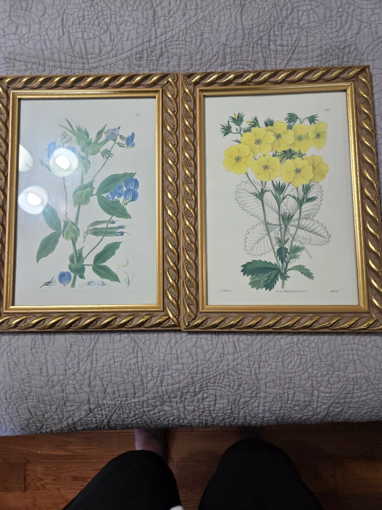 Selling a set of two framed botanical prints! They have a lovely gold-coloured frame and feature detailed illustrations of different flowers. Perfect for adding a touch of nature to your home decor