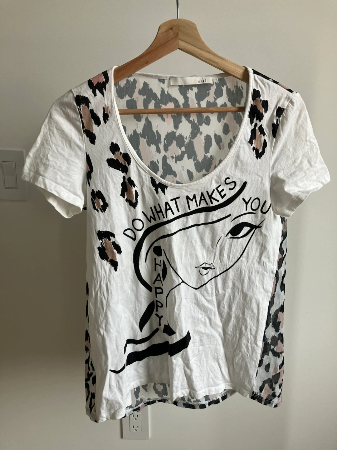 Cute Oui t-shirt with a unique design! It features a graphic print on the front and a stylish animal print on the back. It's a size small and barely worn. Paid about $80 new.