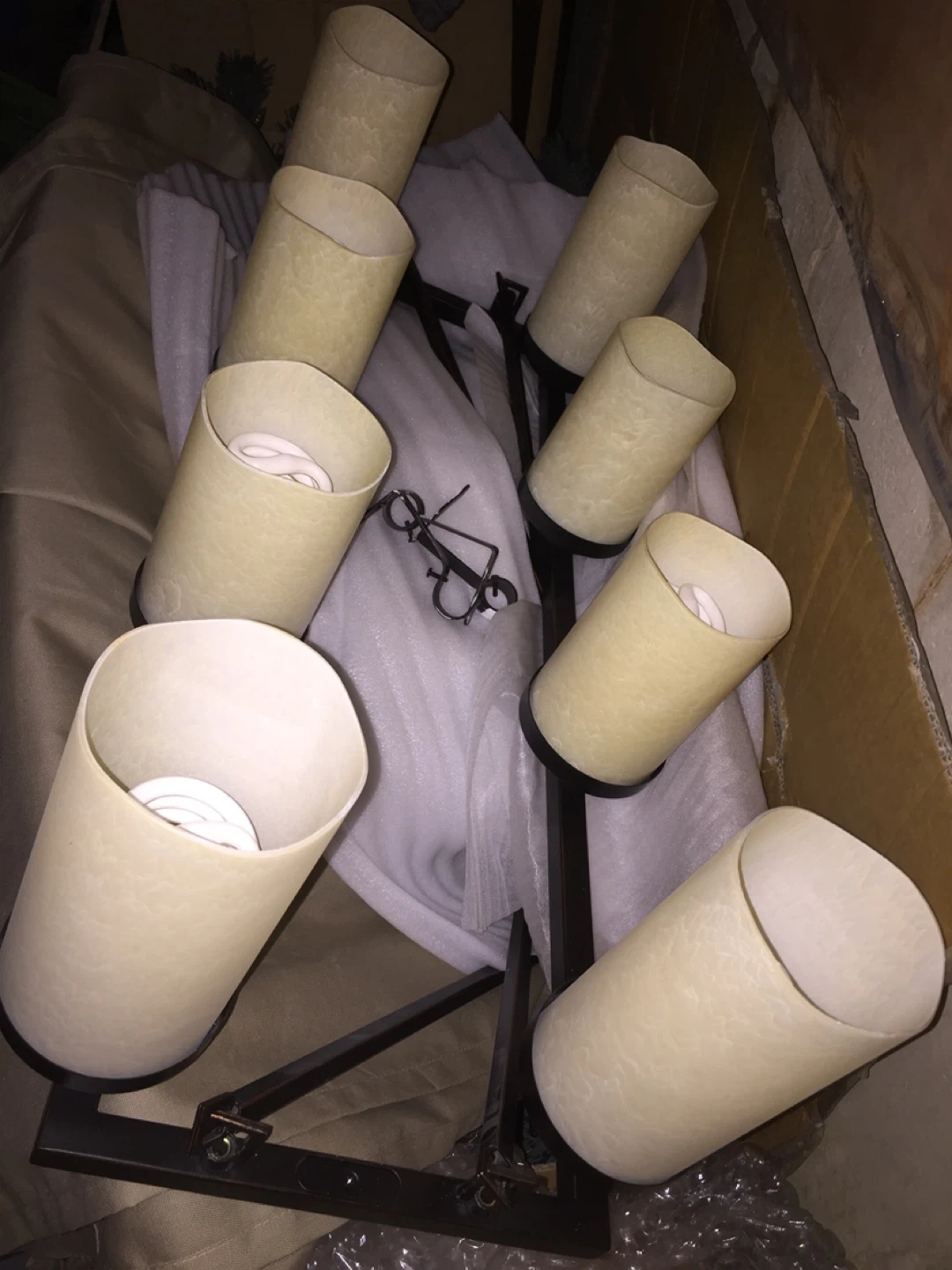 This chandelier has eight cylindrical shades. It comes with energy-efficient bulbs. This fixture would be a lovely addition to a dining room or entryway.