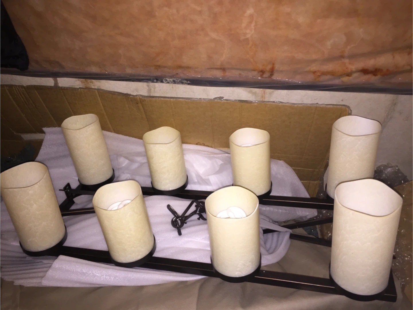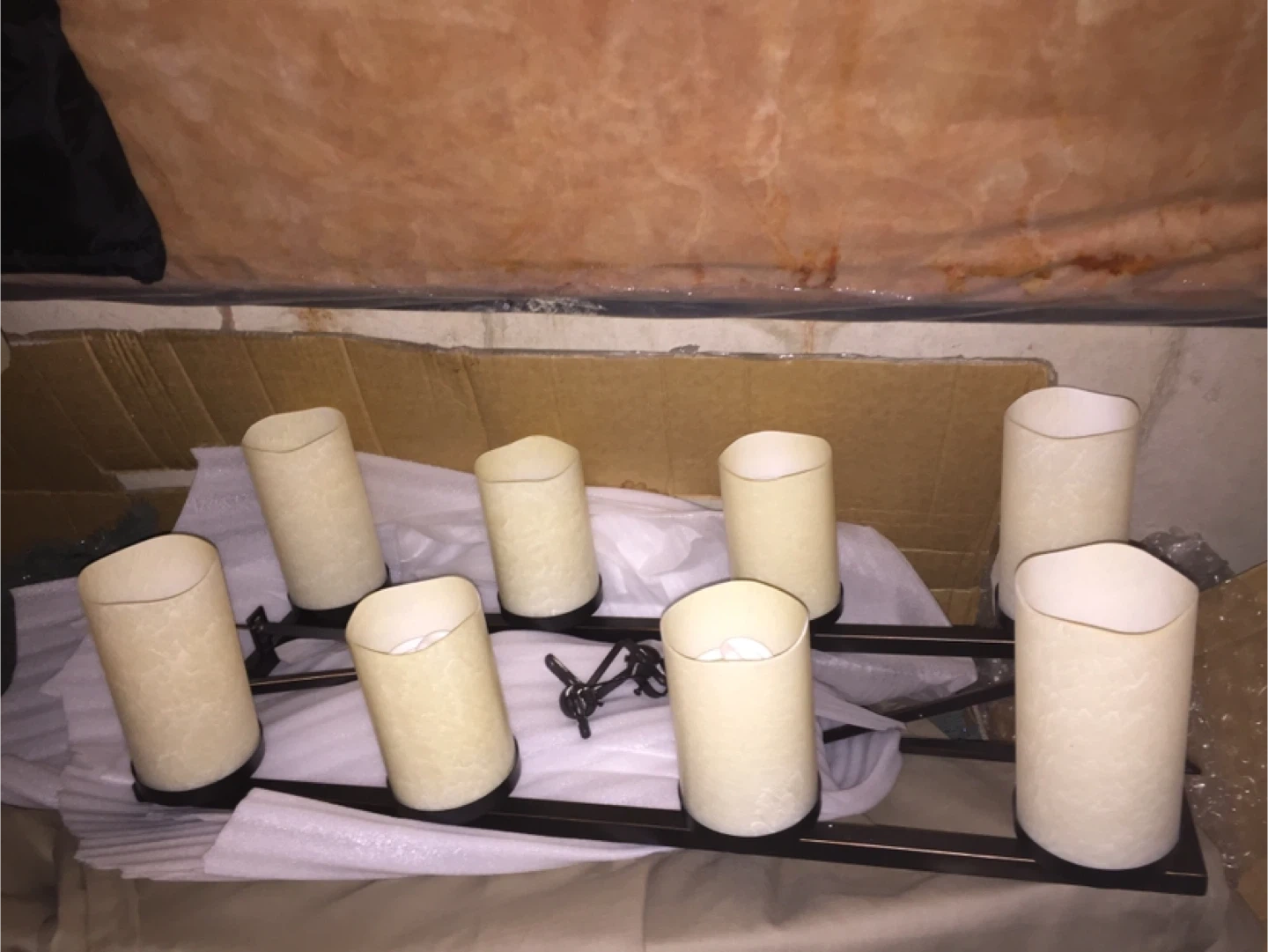 This chandelier has eight cylindrical shades. It comes with energy-efficient bulbs. This fixture would be a lovely addition to a dining room or entryway.