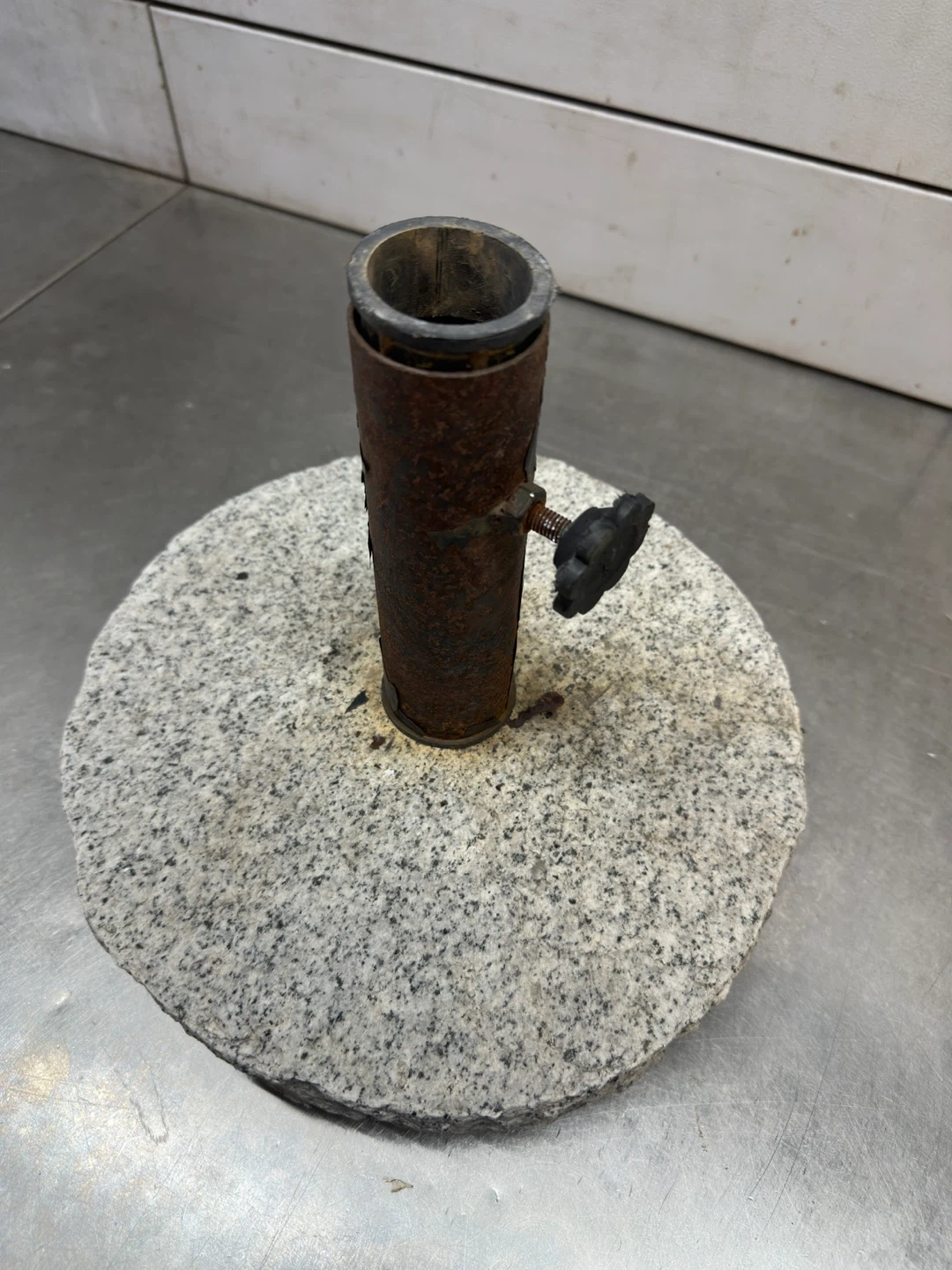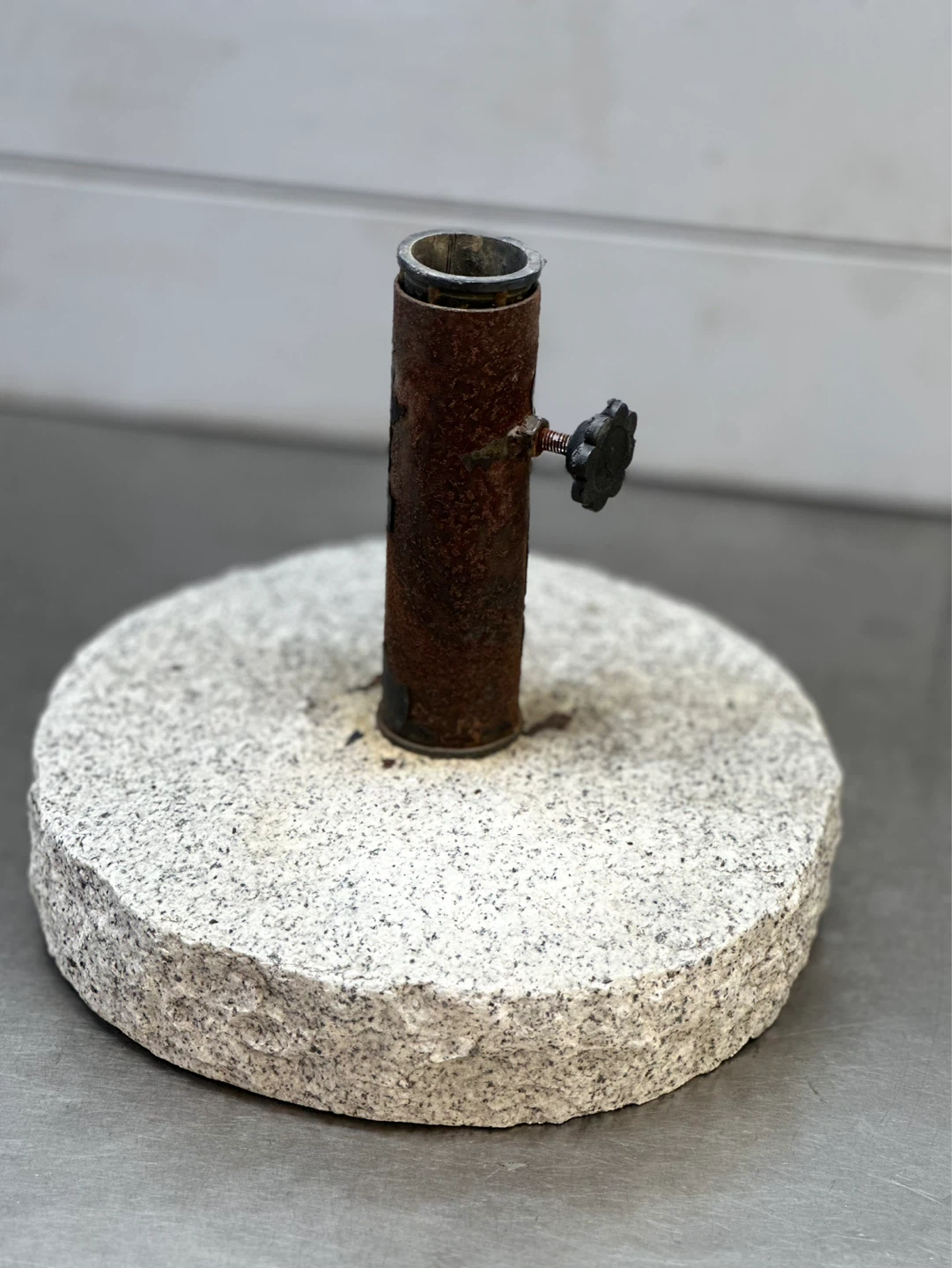 A sturdy umbrella base made from speckled granite. It has a rusted metal tube with a securing screw to hold your umbrella pole. This base is ready to provide stability for your outdoor umbrella.
