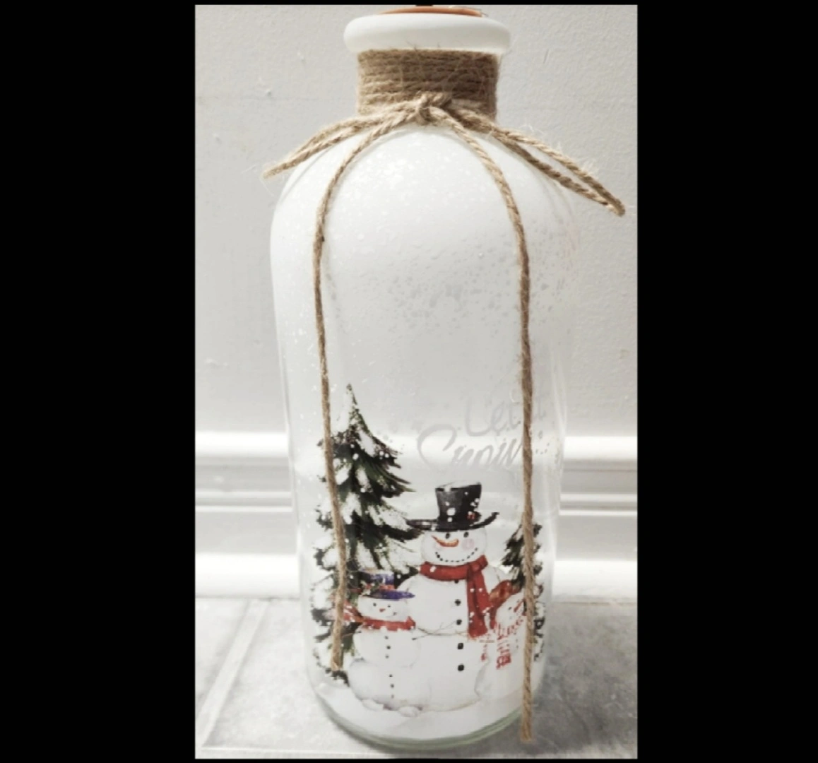 This Christmas deco Bottle is accented with jute around its neck and it features a snowman graphic design on the front , with the words "Let it Snow" script text.