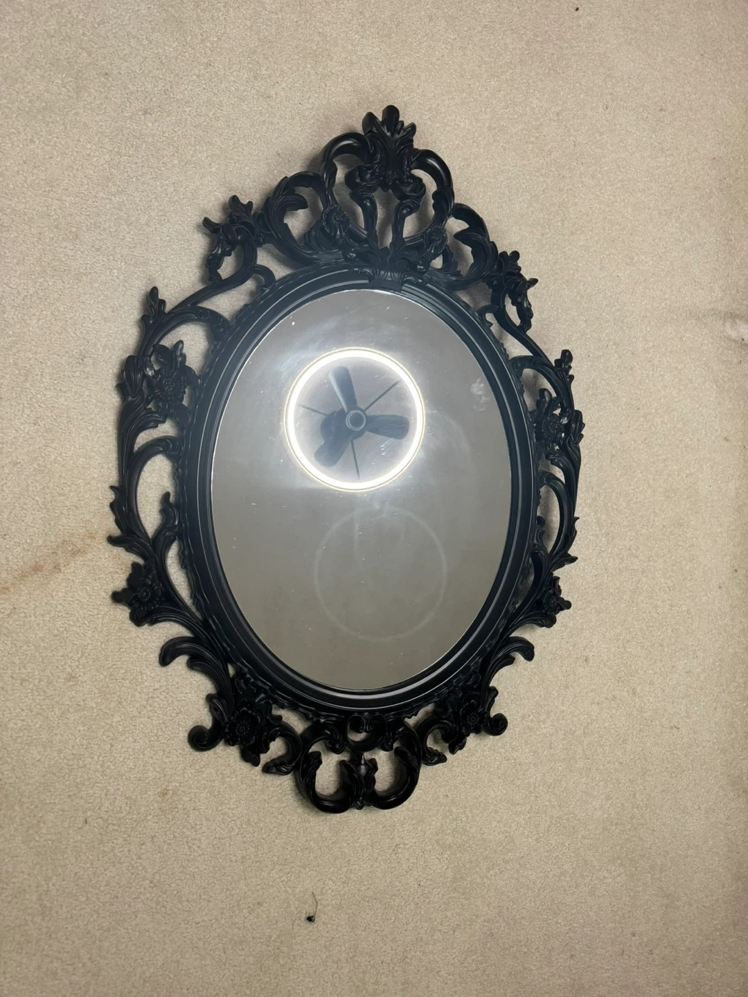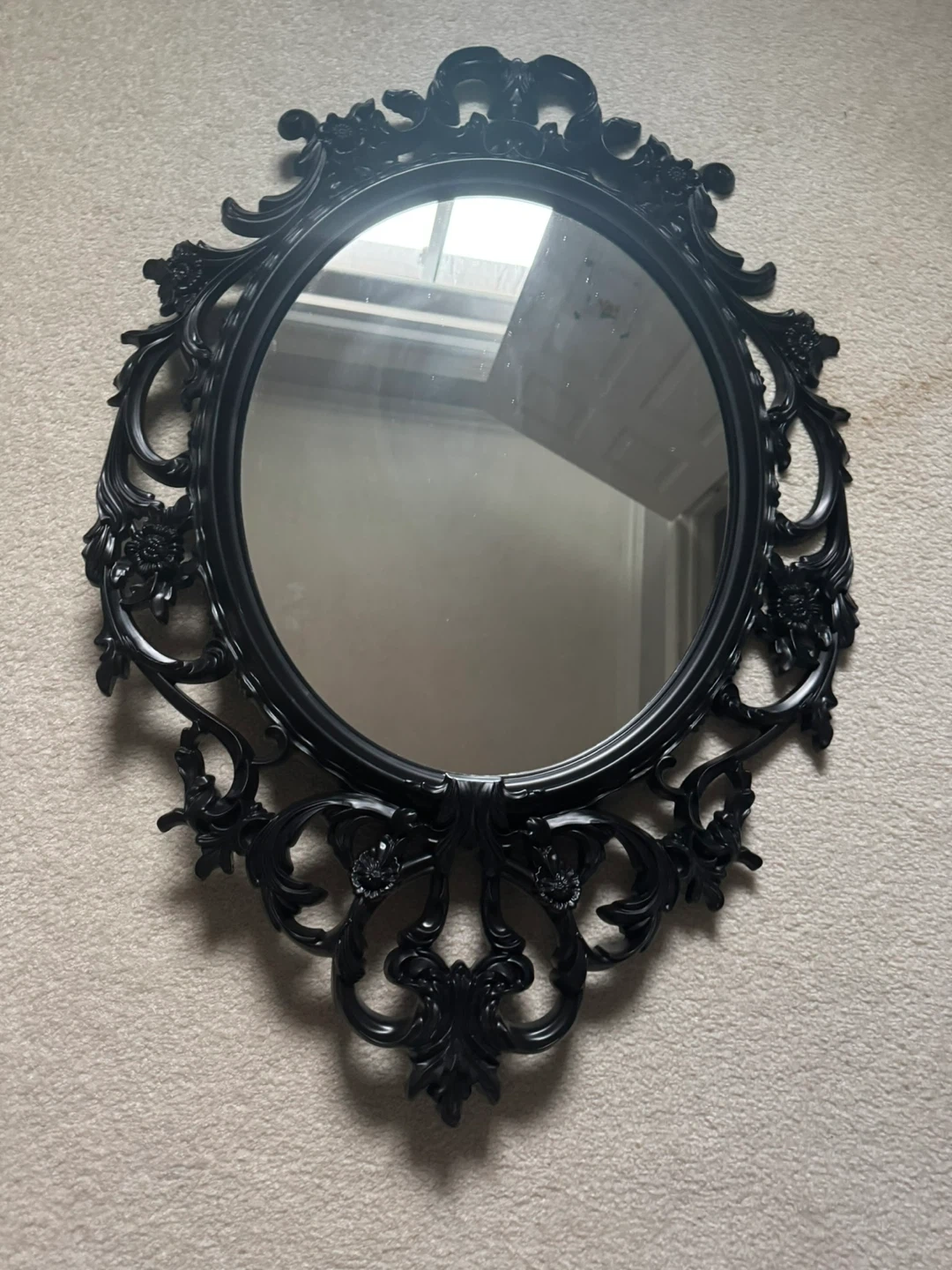 A decorative oval mirror with an ornate black frame. It's great for adding a touch of vintage style to any room. The frame has intricate scrollwork and floral details. 4 available. Take all 4 for $100