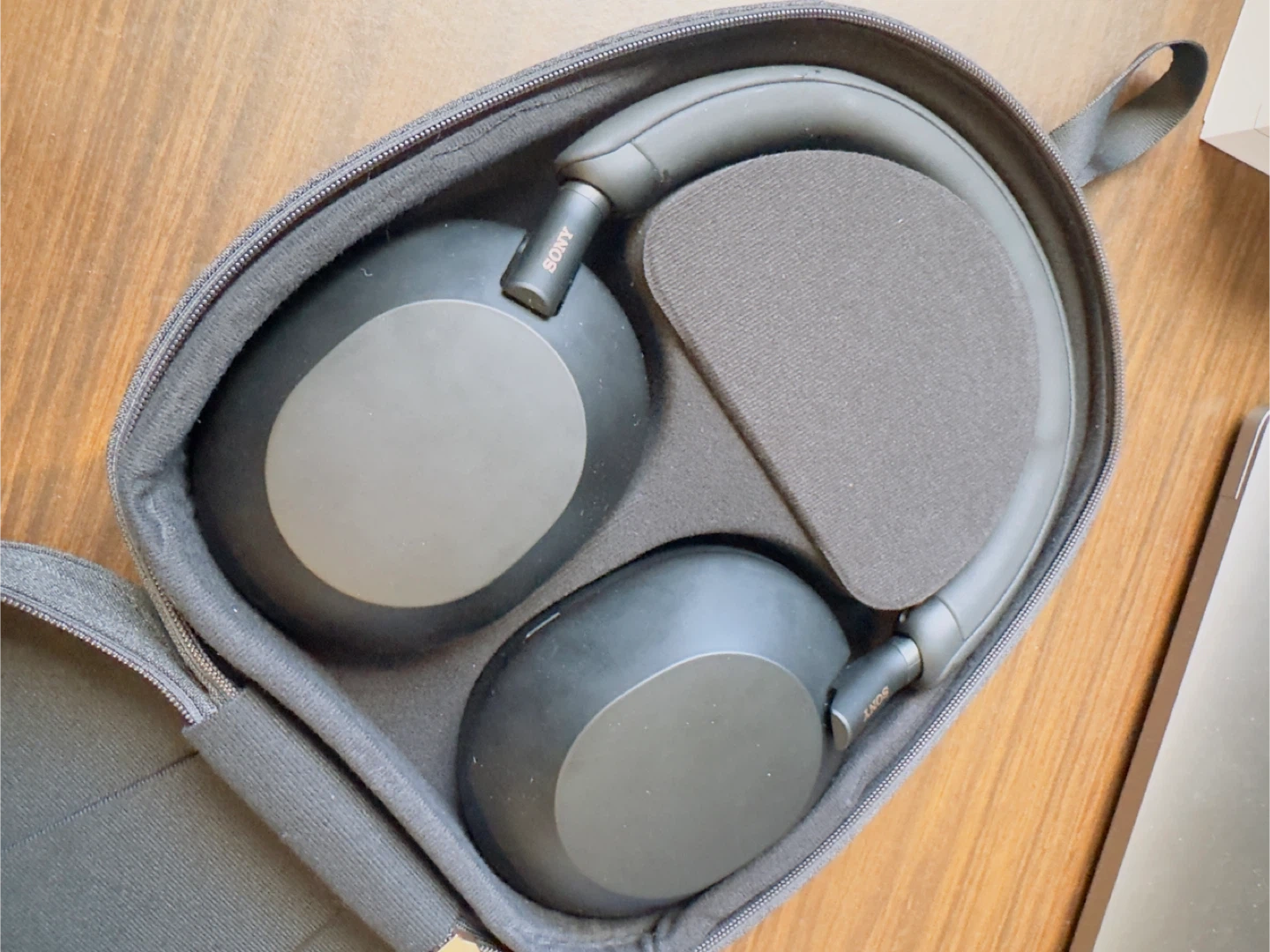 These are the Sony WH-1000XM5 wireless noise cancelling headphones. They come with a black carrying case. These headphones deliver industry-leading noise cancellation and premium sound.