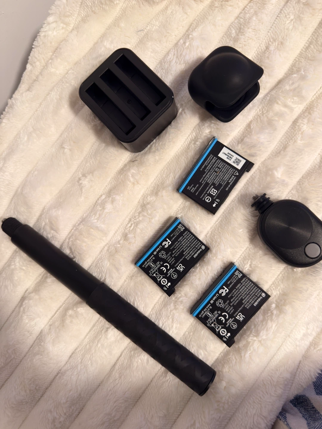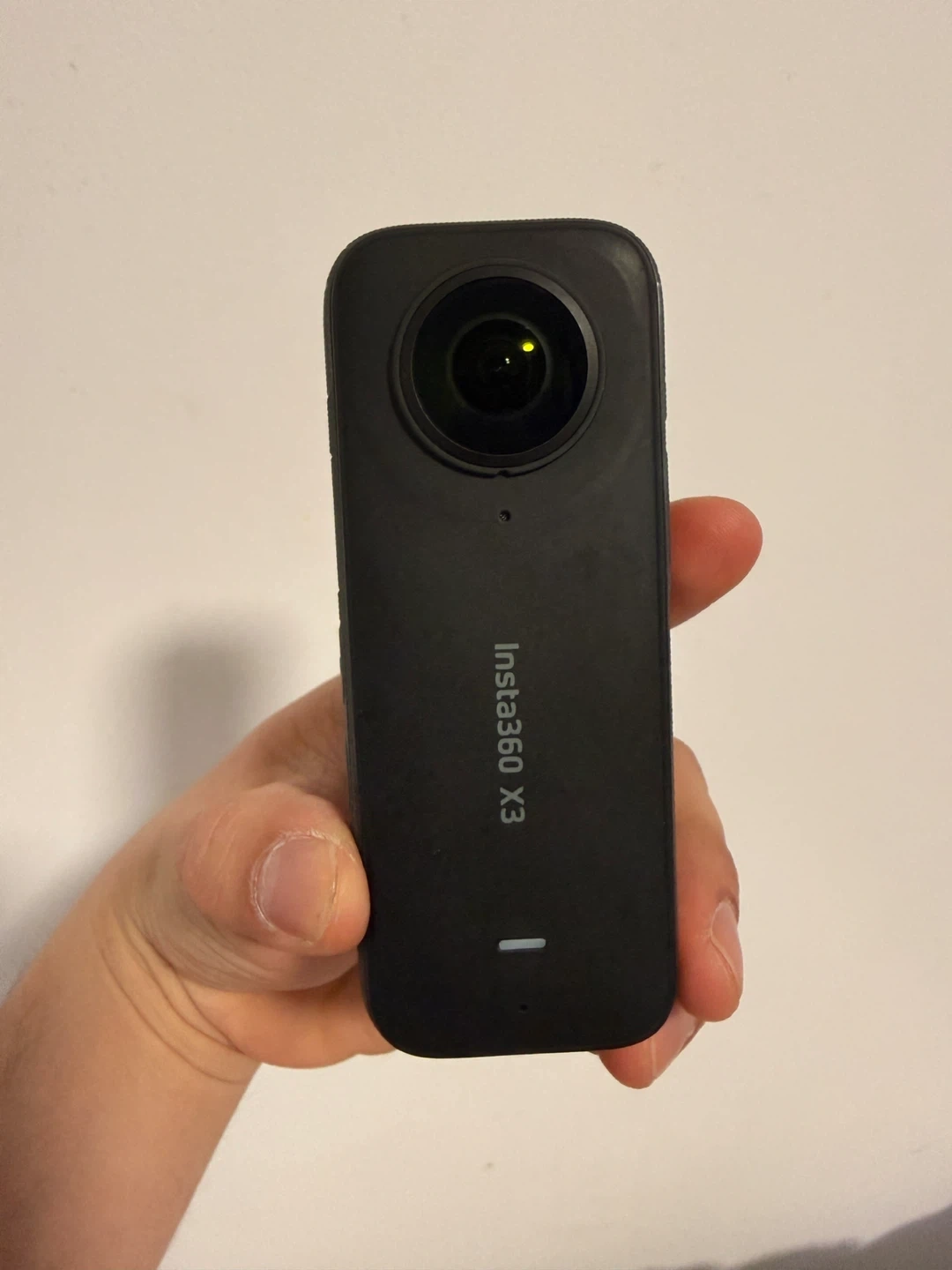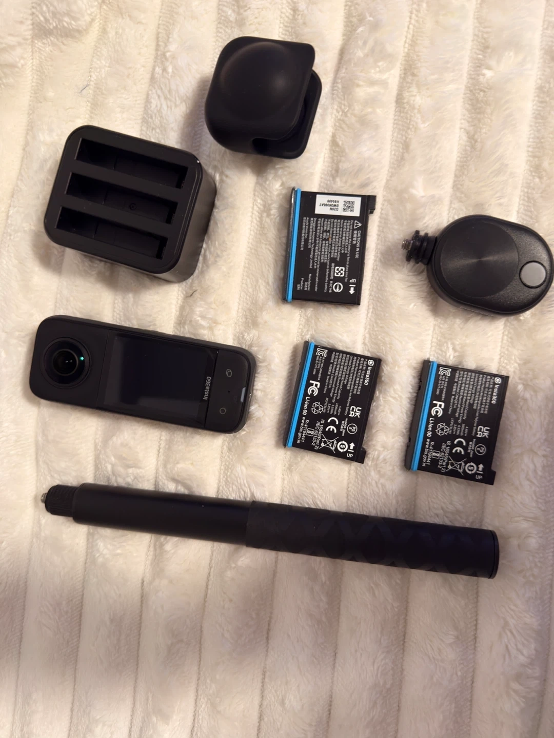 Insta360 X3 360 action camera. Includes a selfie stick, dual battery charger, and three batteries. This camera's small size makes it great for capturing immersive video on the go!