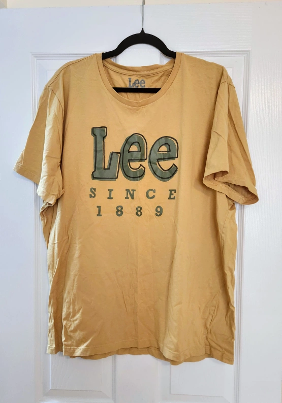 Men's Lee brand t-shirt. Mustard yellow colour. Features a vintage Lee logo graphic on the front. Short sleeves. Crew neck.