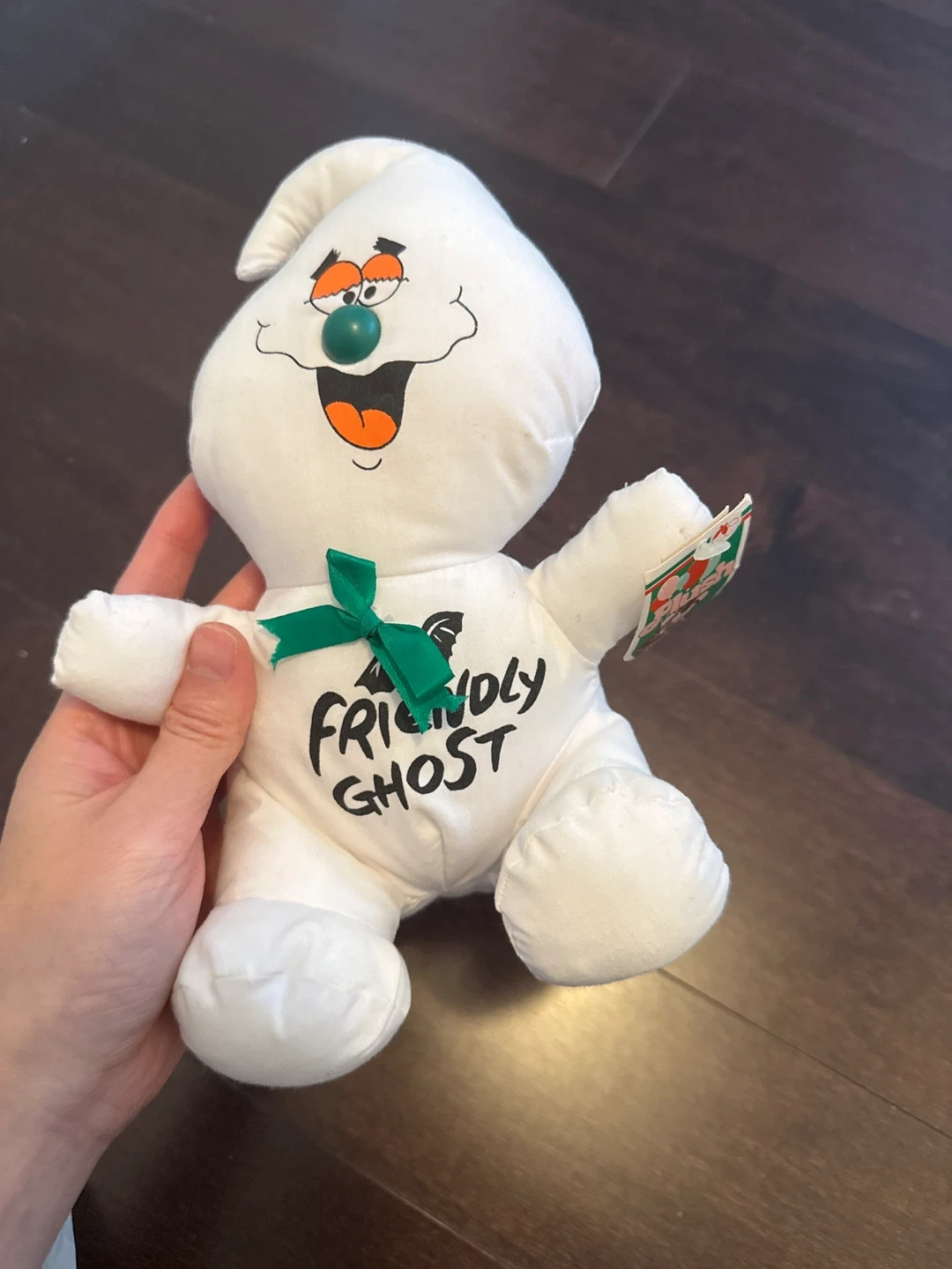This soft and cuddly plush toy features a friendly ghost design. It's surface washable for easy cleaning. This toy is suitable for children 18 months and over. New one with tag