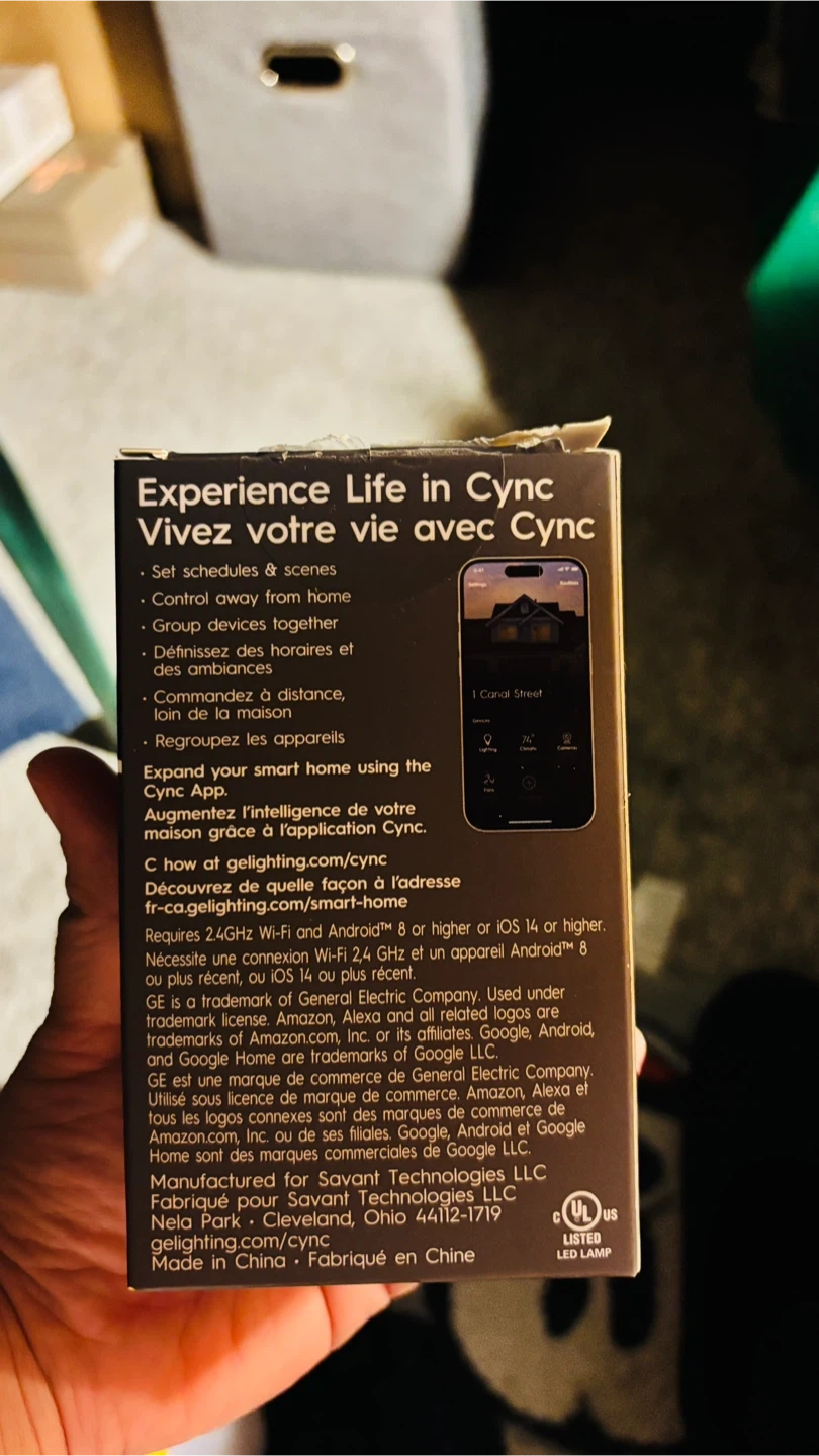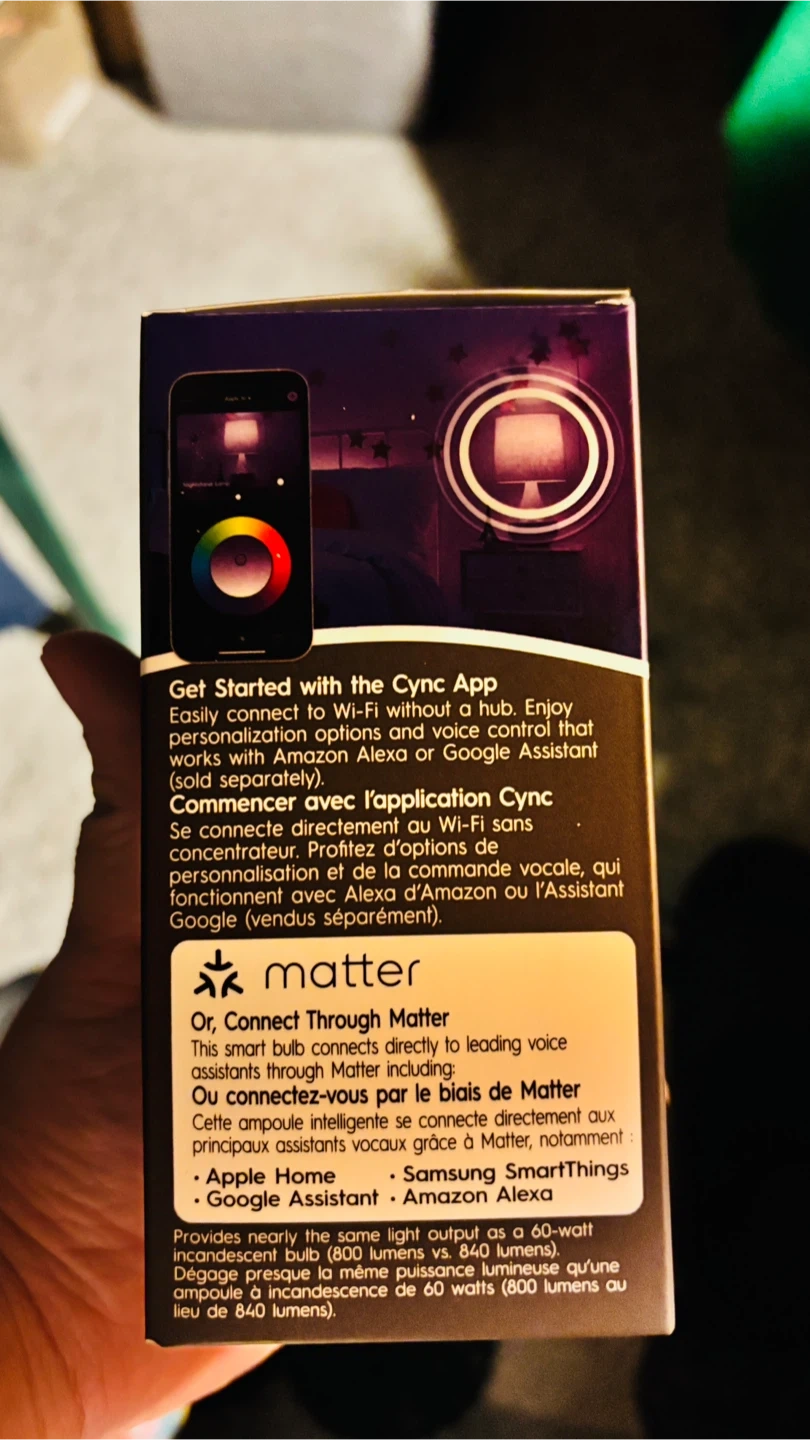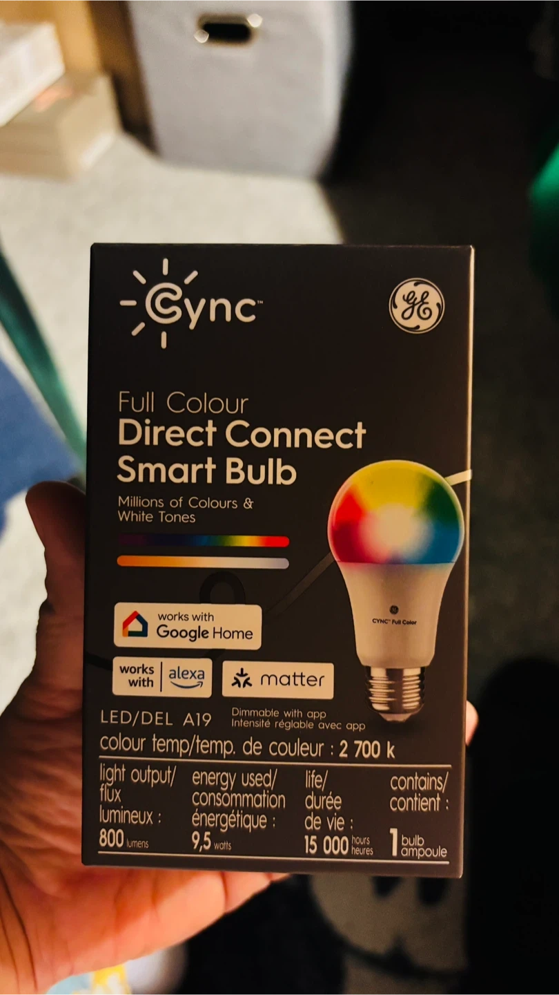 This GE Cync smart bulb offers millions of colours and white tones, controllable with the Cync app or voice assistants. It provides 800 lumens and uses 9.5 watts, equivalent to a 60-watt incandescent bulb. It connects directly to Wi-Fi without a hub, supporting Matter, Alexa, and Google Home. 15,000 hours of life. Comes with free other brand of smart bulb.