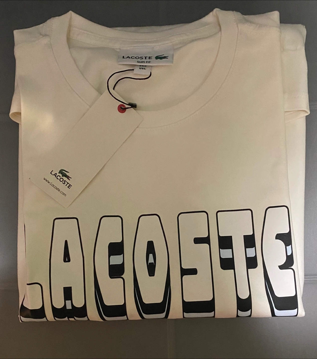 Here is a stylish cream-coloured t-shirt with the brand name displayed prominently. It has a rounded neck, and is new with tags. You can relax in this very comfortable t-shirt.