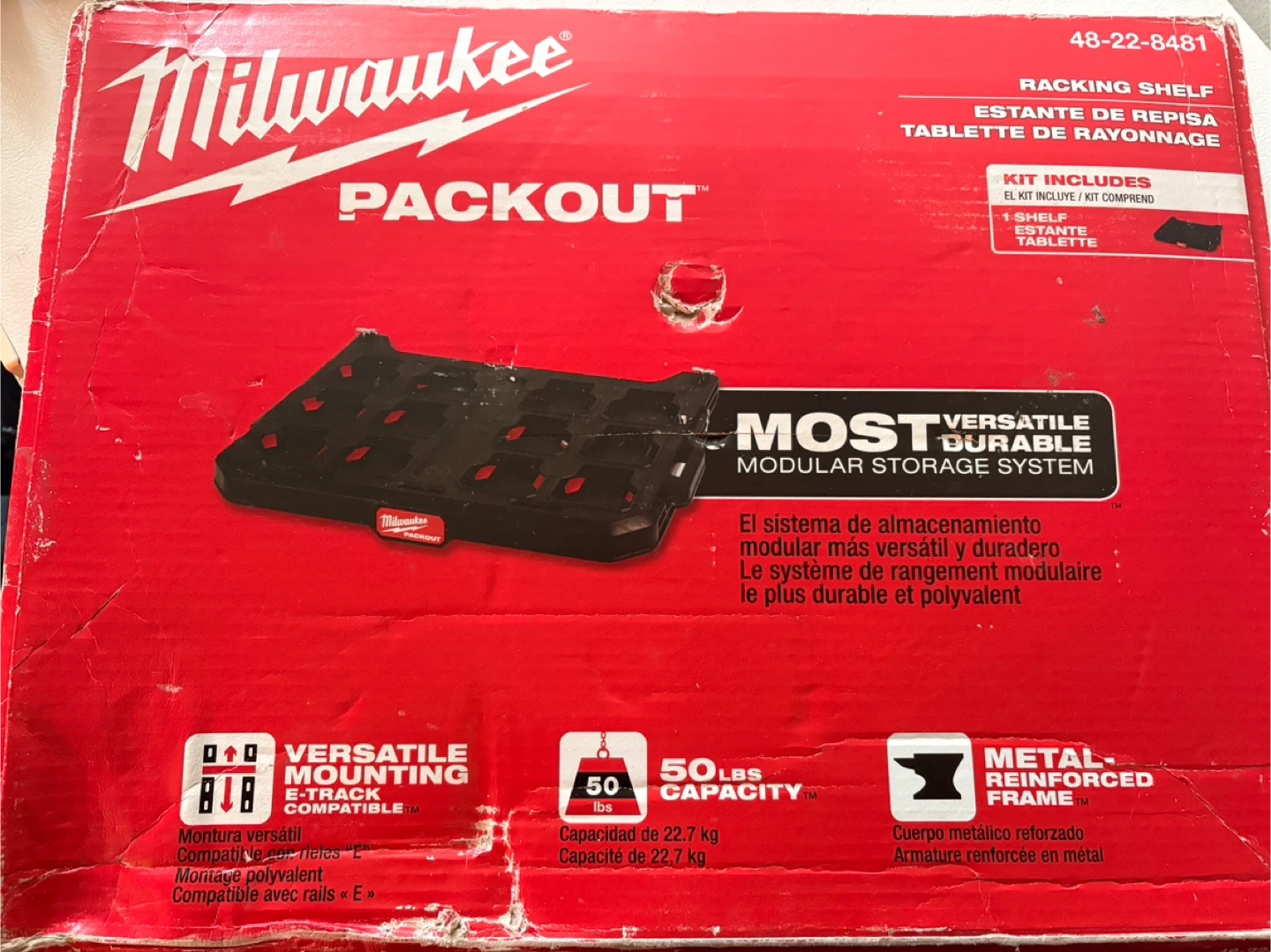 This is a Milwaukee PACKOUT racking shelf for a modular storage system. It features versatile mounting and a metal-reinforced frame. The capacity is 50 lbs.