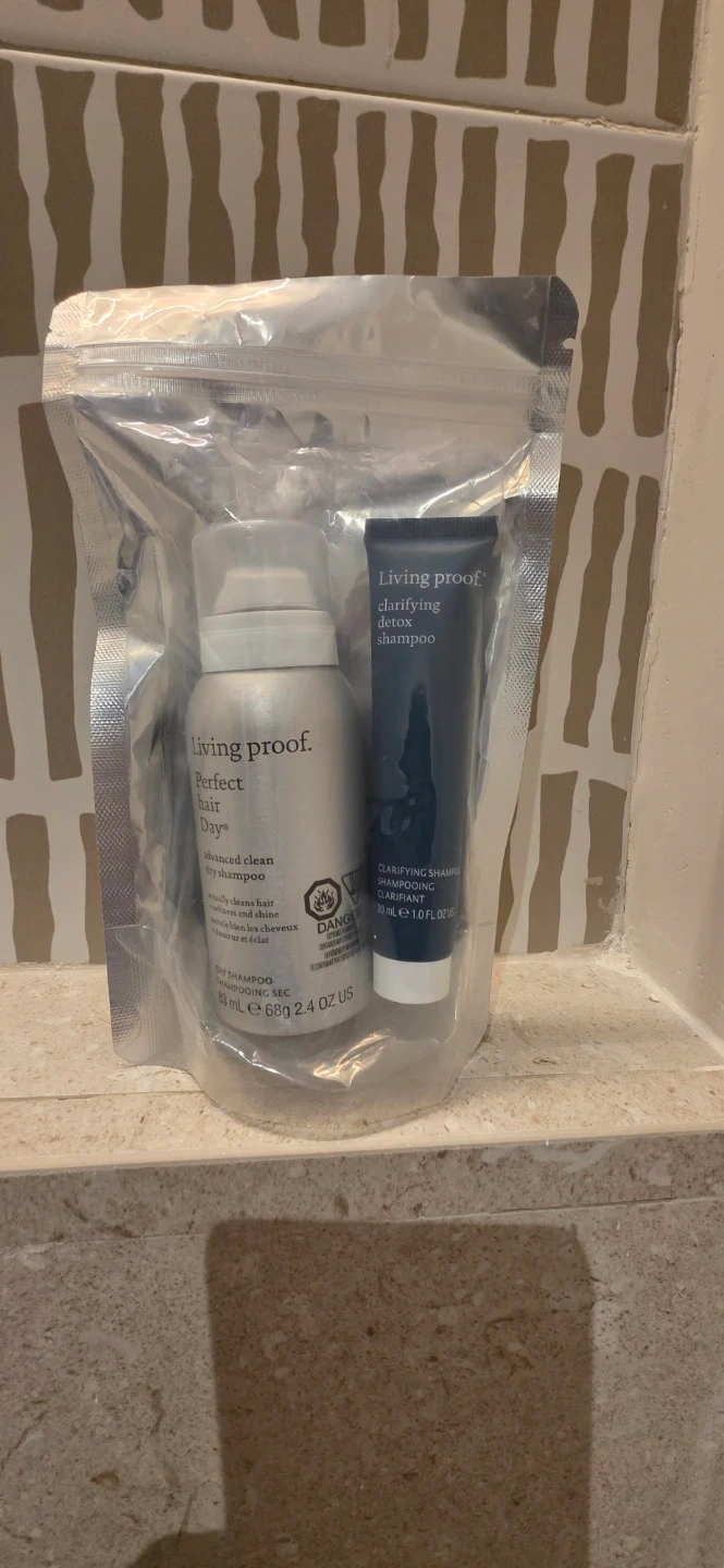 This set includes Living Proof Perfect Hair Day advanced clean dry shampoo (83 mL / 2.4 OZ US) and clarifying detox shampoo (30 mL / 1.0 FL OZ US). It's great for keeping hair clean and shiny on the go!