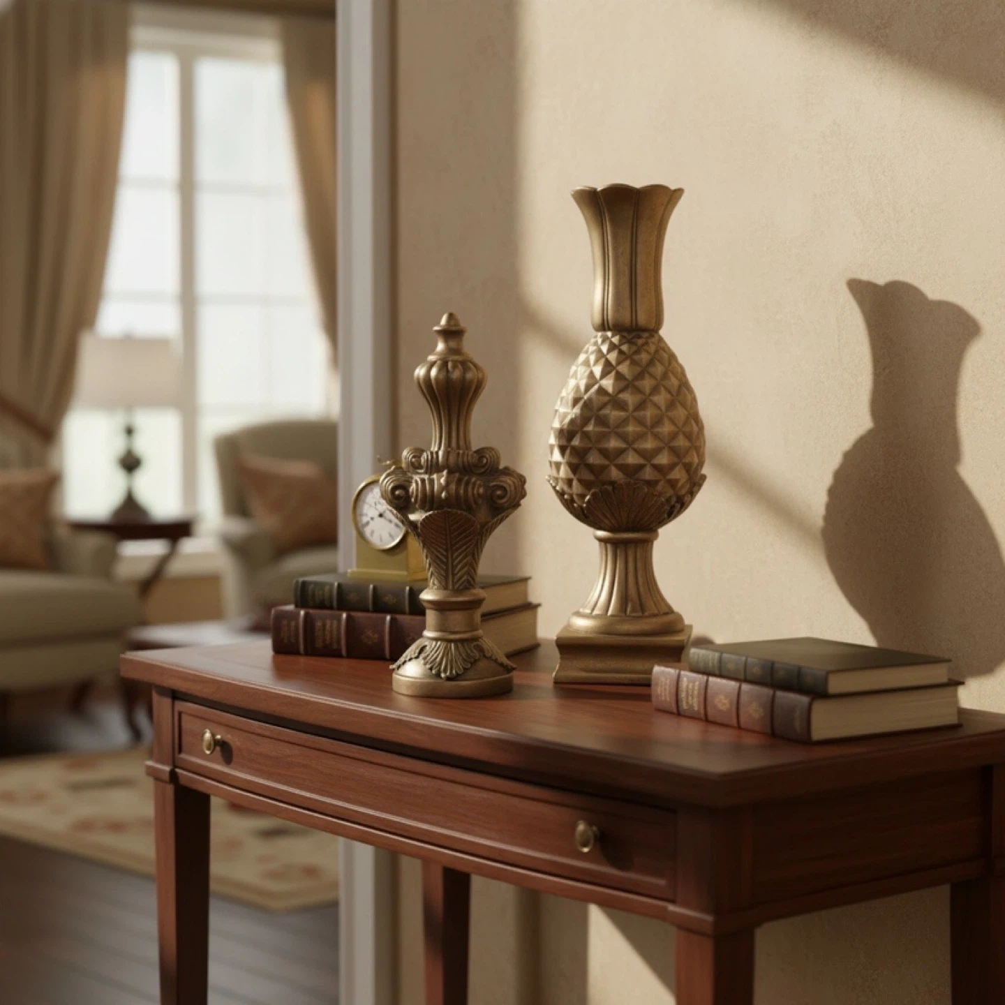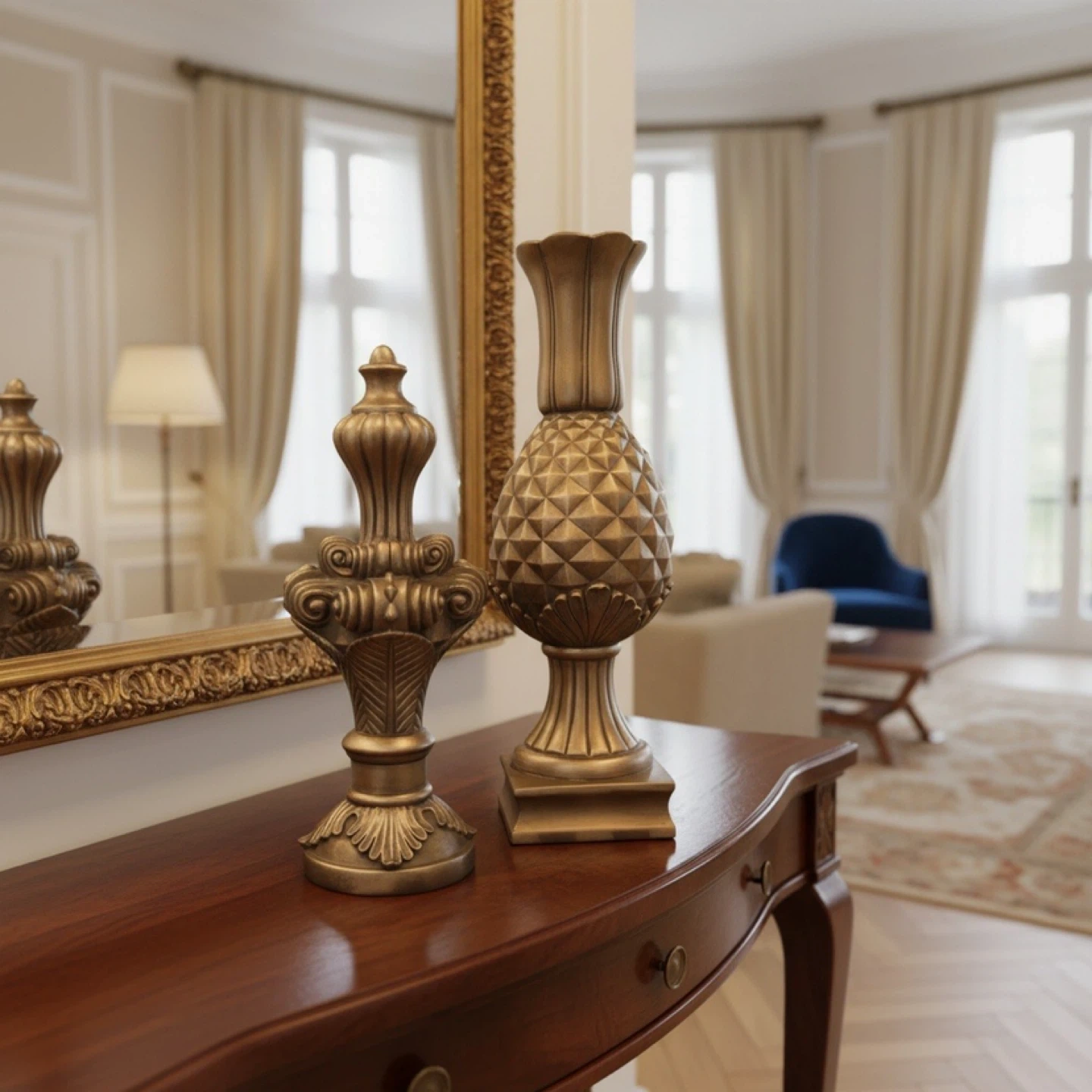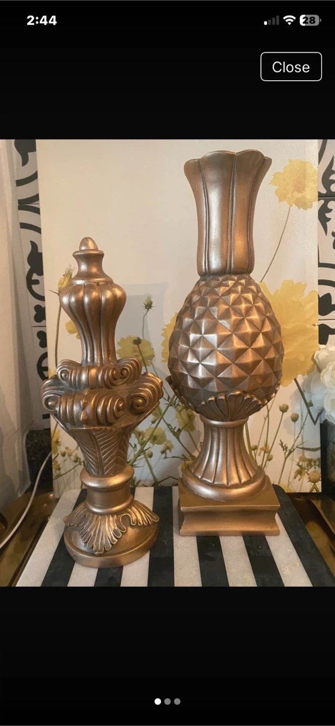 This set includes two ornate gold decorative pieces. One resembles a classic finial, while the other is shaped like a pineapple. They're perfect for adding a touch of elegance to any room!@casa_s_decor Pick up in the Bronx