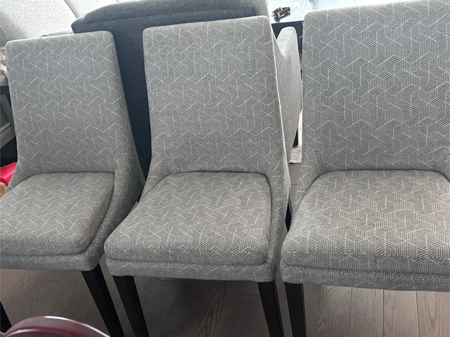 6 very nice dining chairs upholstered in a grey geometric fabric. Chairs have dark wood legs. They're comfortable and stylish for any dining room. They were professionally cleaned before posting, although they have been well kept and are in very good condition.