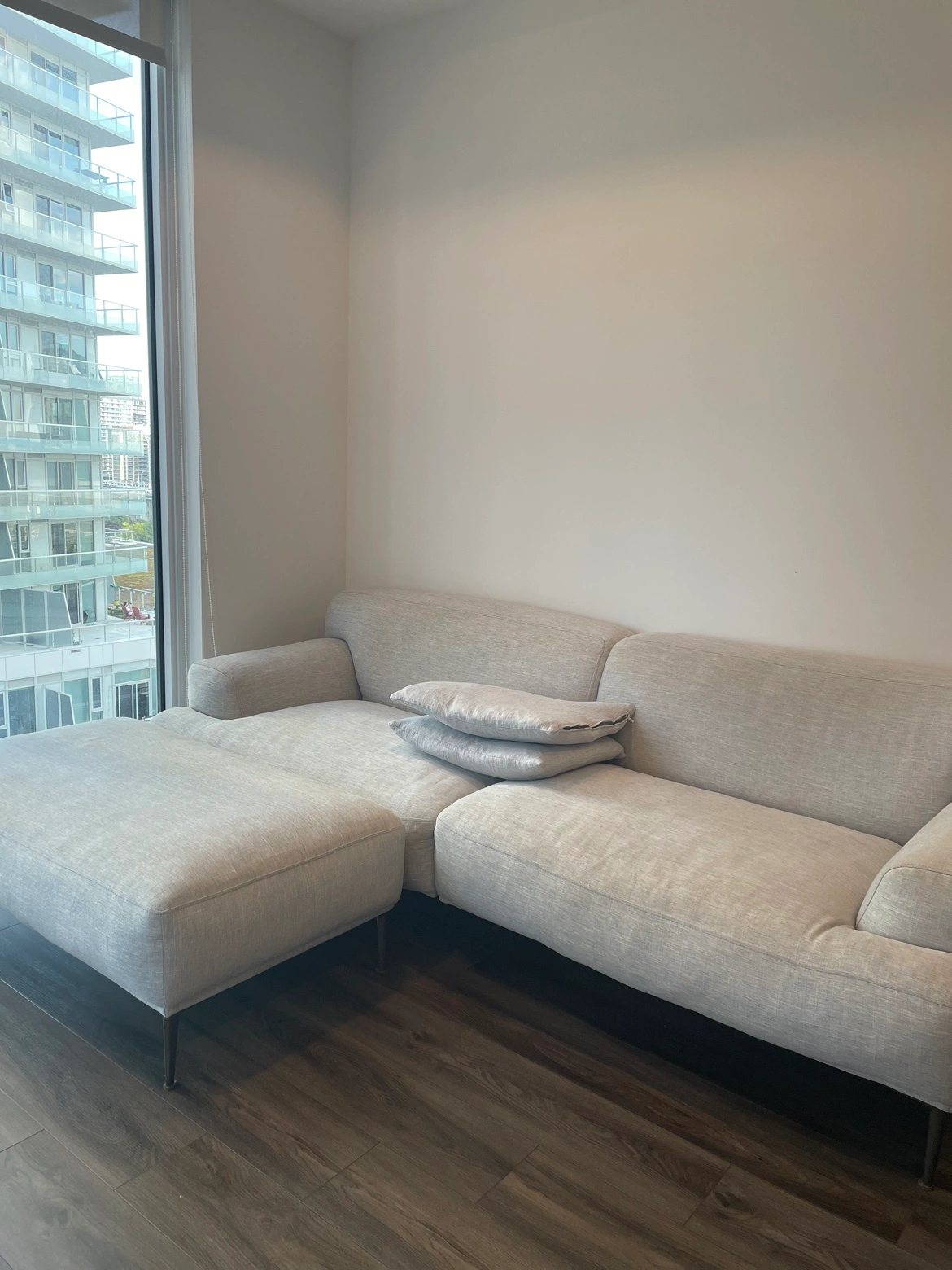 This is a sectional sofa with an ottoman and 2 pillows. The condition is very good. We bought it 1.5 years ago. Selling it just because we are looking for a sofa that transforms into a bed.